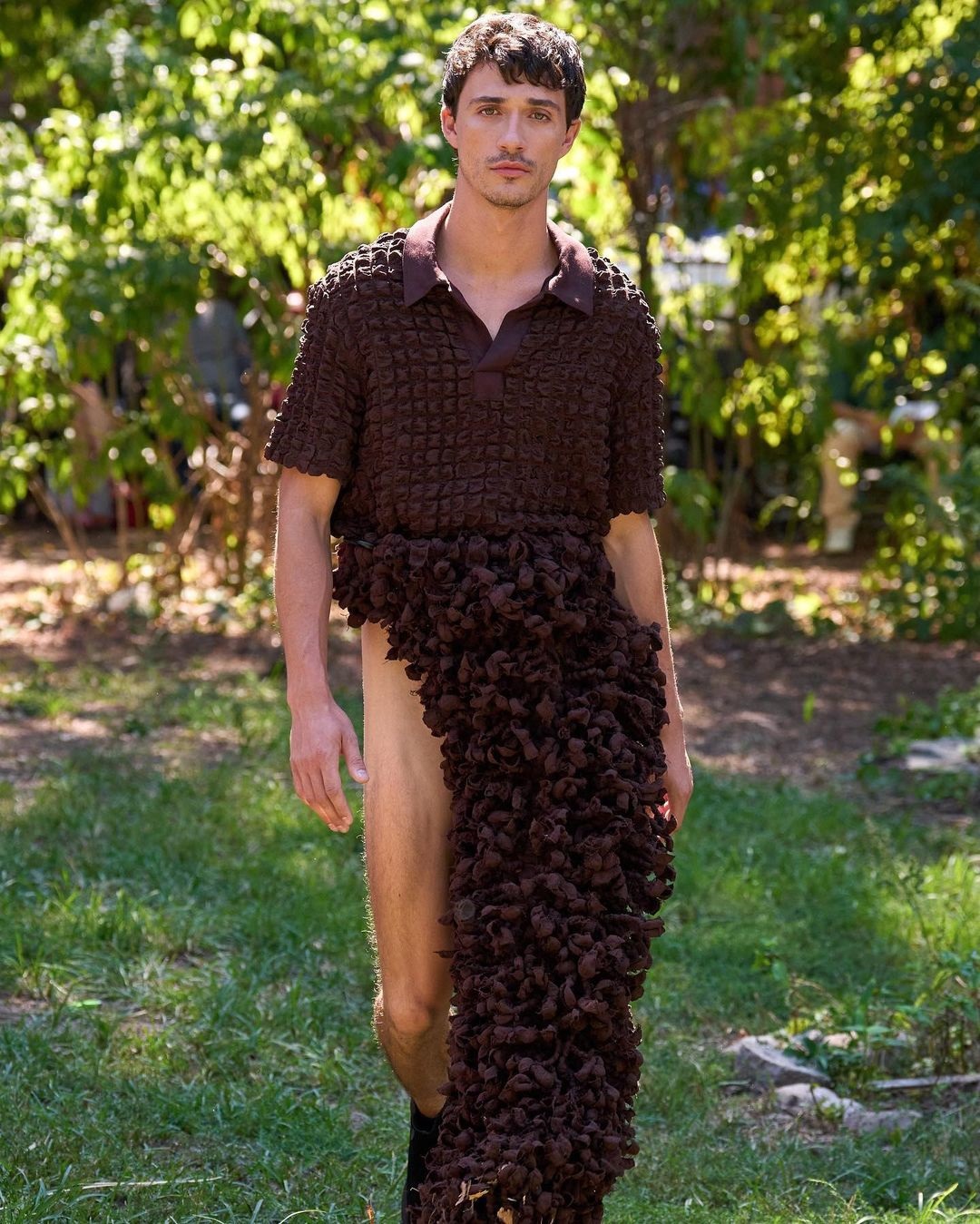 Στο show του οίκου Eckhaus Latta, ένας άνδρας μοντέλο φορούσε ένα καφέ-μαύρο και παντελόνι με ιδιαίτερη υφή και ύφασμα που τύλιγε το ένα μόνο πόδι του.