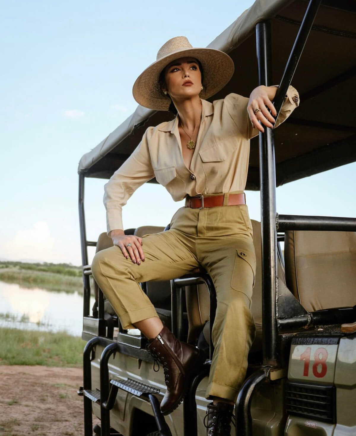 Safari head to toe: αν από την άλλη είστε fan του συγκεκριμένου look, δοκιμάστε να κάνετε μια αντιγραφή της παραπάνω εικόνας, από την οποία δεν λείπει τίποτα. Ένα cargo παντελόνι σε χακί απόχρωση και με ζώνη, ένα χυτό πουκάμισο με τσέπες, basic αρβυλάκια και ένα statement καπέλο αρκούν για να αναδειχτείτε ως η απόλυτη βασίλισσα του safari look.