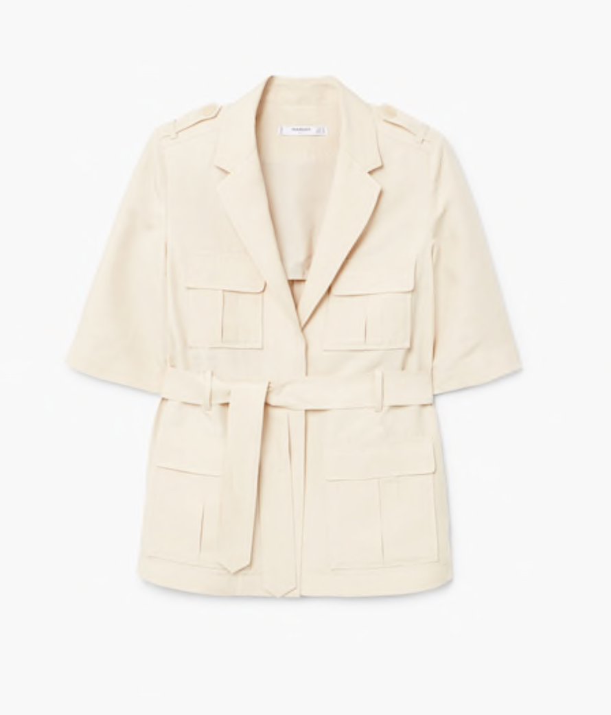Λινό, κοντομάνικο σακάκι με ζώνη Mango, μπορείτε να το βρείτε εδώ.