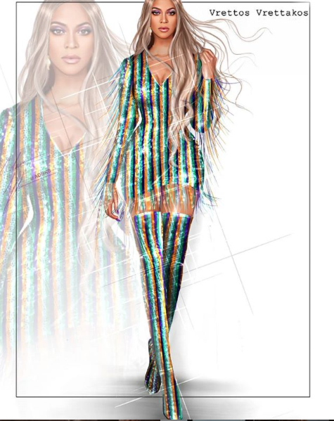 Πιο συγκεκριμένα, η Βασίλισσα της Pop φοράει μία ολοκέντητη κρυστάλλινη Haute Couture δημιουργία με 450.000 κρύσταλλα, στα χρώματα της Αφρικής. Πορτοκαλί, τιρκουάζ, σμαραγδί και βιολετί ενώνουν τις δυνάμεις τους δημιουργώντας ένα εντυπωσιακό καλειδοσκόπιο χρωμάτων που μαγνητίζουν το βλέμμα και αποτυπώνουν τον πλούτο του Αφρικανικού πολιτισμού. Το look ολοκληρώνει ένα εκπληκτικό ζευγάρι custom–made μπότες TSAKIRIS MALLAS με κρύσταλλα Swarovski, στο ίδιο μοτίβο με το φόρεμα. Οι ψηλές μπότες φτάνουν μέχρι τους μηρούς και προσδίδουν ένα υπέροχο αποτέλεσμα εφαρμογής, χάρη στην καστόρινη ελαστική βάση τους.