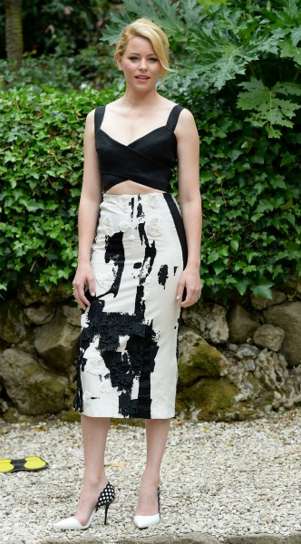 Η Elizabeth Banks εμφανίστηκε στην παρουσίαση της ταινίας Pitch Perfect 2 -που έλαβε χώρα στη Ρώμη- με ένα chic σύνολο που μας ενθουσίασε. Η αμερικανίδα ηθοποιός επέλεξε ένα look από την ανοιξιάτικη συλλογή της σχεδιάστριας Donna Karan, το οποίο αποτελούνταν από μαύρο bralet και midi λευκή φούστα με μαύρα prints. Ολοκλήρωσε την εμφάνιση με λευκές γόβες με πουά λεπτομέρειες, Sophia Webster.