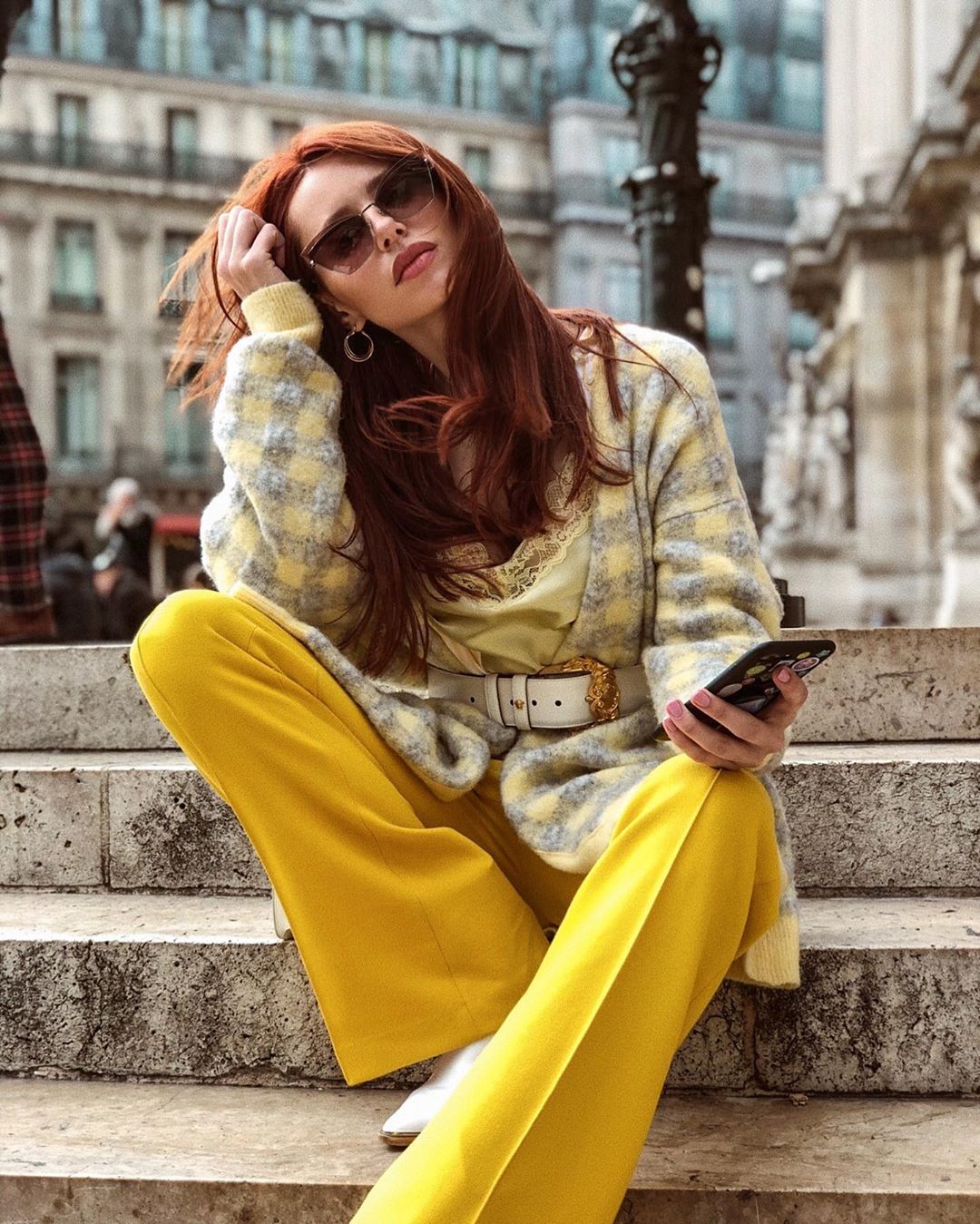 Έναν πολύ κομψό τρόπο για να φορέσουμε την αγαπημένη μας ζακέτα μας δείχνει η Έβελυν Καζαντζόγλου. Η fashionista δημιούργησε ένα look που την έκανε να μοιάζει με γαλλίδα fashionista, συνδυάζοντας μία ψηλόμεση παντελόνα σε κίτρινη απόχρωση με ένα lingerie σε baby yellow απόχρωση και μία καρό oversized ζακέτα. Η Έβελυν φρόντισε να τονίσει τη μέση της με μία λευκή ζώνη, ενώ ολοκλήρωσε το look της με ένα ζευγάρι λευκές cowboy μπότες.