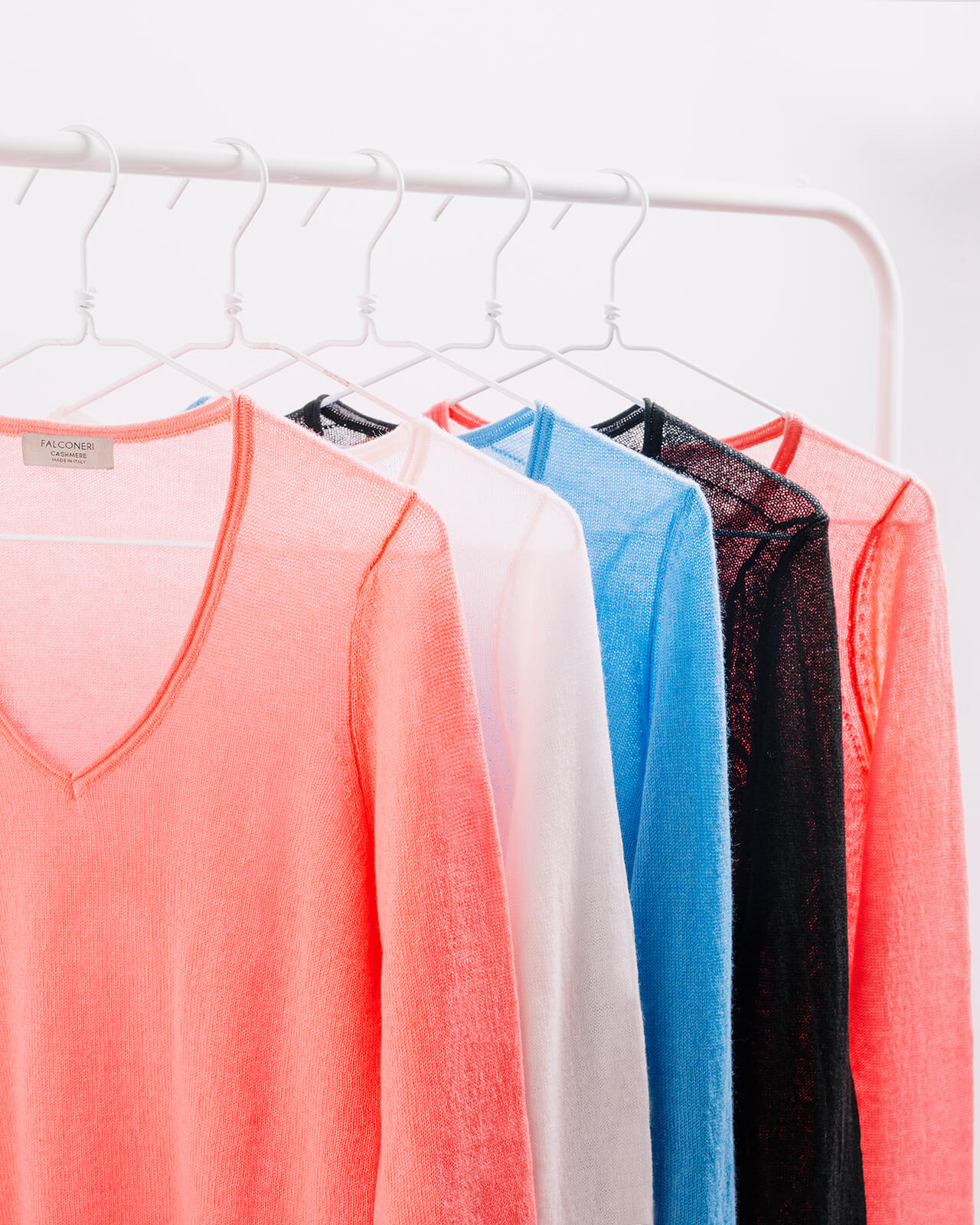 Iconic σε λευκό, κομψό σε μαύρο, και σαγηνευτικό σε γαλάζιο και ροζ στην απόχρωση της τσιχλόφουσκας, τα νήματα είναι 100% βαμμένα και επεξεργασμένα στην Ιταλία. Το πουλόβερ Nuvola βγαίνει σε δύο εκδοχές: με V και στρογγυλή λαιμόκοψη.