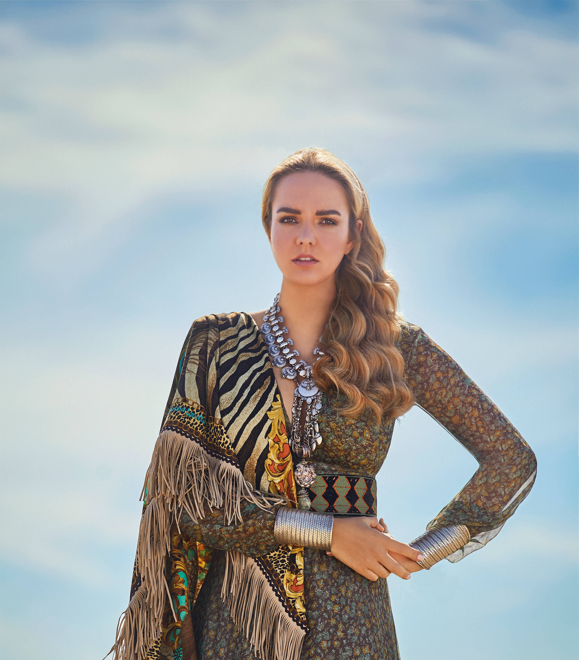 Roberto Cavalli φόρεμα, εσάρπα με κρόσσια και κοσμήματα, όλα από προσωπική συλλογή.
