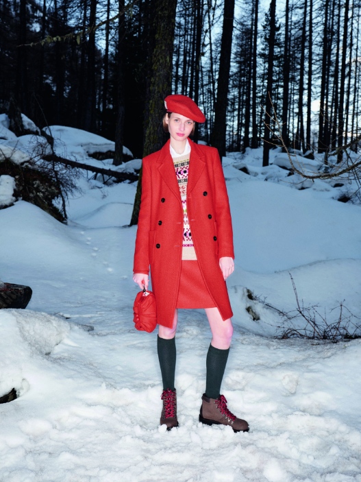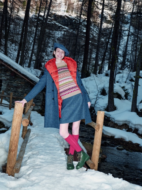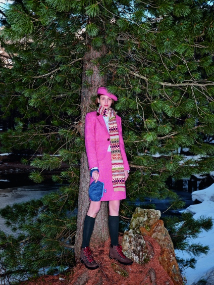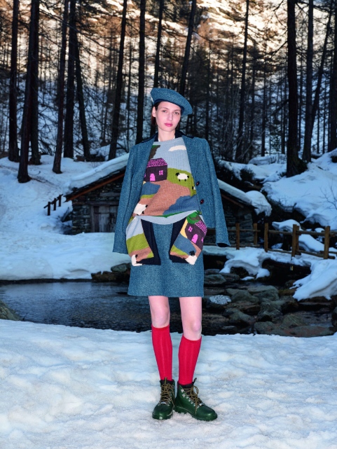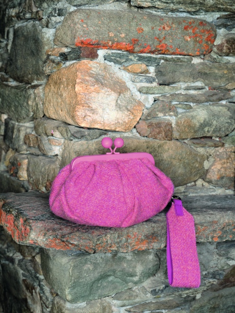 Παιχνιδιάρικα πουλόβερ με λαιμόκοψη σε ζωηρό πλεκτό μοτίβο ή αναπαριστώντας το γεμάτο λόφους τοπίο του νησιού, αιωρούνται τριγύρω μαζί με υπέροχους μπερέδες και κασκόλ. Η Pasticcino Bag, σε Harris Tweed®, κρέμεται από ένα δέντρο στην αυλή του σπιτιού, όμως το θαλάσσιο πουλί του Ατλαντικού είναι λυπημένο γιατί δεν μπορεί να την φτάσει.
