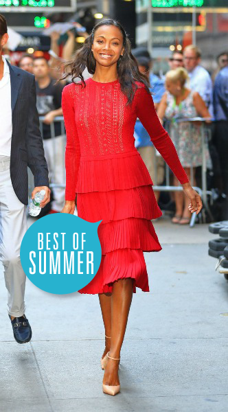 Θέλετε να βάλετε κόκκινο αλλά να μη δείχνετε υπερβολικά σέξι; Η Zoe Saldana μας έδειξε τον τρόπο. Η ηθοποιός εντοπίστηκε στους δρόμους της Νέας Υόρκης με ένα κατακόκκινο μίνι φόρεμα με βολάν, Oscar de la Renta, το οποίο συνδύασε με nude γόβες και τα μαλλιά πιασμένα μισά μισά. Ολοκλήρωσε το look με natural μέικαπ. Μπορεί να φορεθεί και το φθινόπωρο.