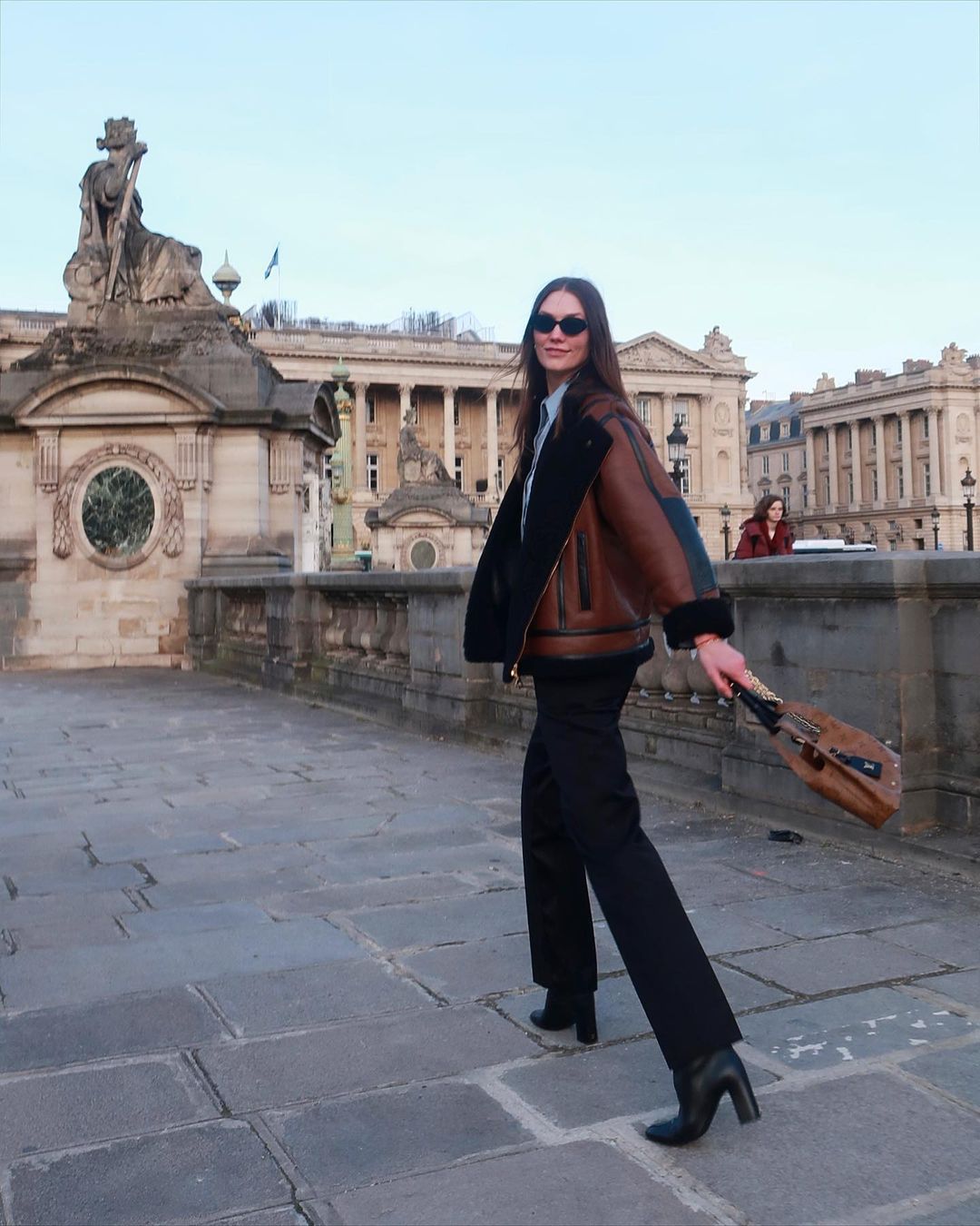 Κατά την άφιξή της στην πόλη που αποτελεί συνώνυμο της μόδας, το Παρίσι, η 31χρονη Αμερικανίδα επέλεξε ένα μαύρο παντελόνι σε ίσια γραμμή με σατέν λεπτομέρειες στο πλάι, αυστηρό πουκάμισο και καφέ δερμάτινο μπουφάν με εσωτερική γούνινη επένδυση. Είχε τα μαλλιά της λιτά, φόρεσε μαύρα γυαλιά ηλίου, ψηλοτάκουνα παπούτσια και κρατούσε μια cross body Louis Vuitton τσάντα.