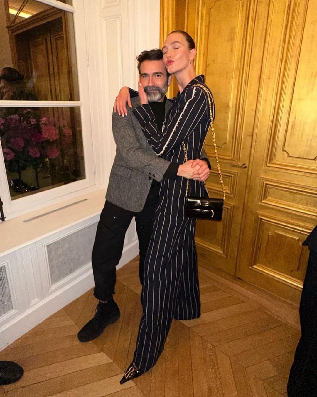 Αργότερα, επέλεξε ένα ναυτικό μπλε κοστούμι σε ριγέ γραμμή καθώς παρακολούθησε το σόου της Schiaparelli για την Άνοιξη/Καλοκαίρι 2024. Το κοστούμι της Karlie περιλάμβανε ένα σακάκι σε στιλ blazer και ένα ασορτί φαρδύ παντελόνι. Φρόντισε να τυλιχτεί ζεστά στον ψυχρό καιρό του Παρισιού, φορώντας ένα μακρύ σκούρο παλτό πάνω από το σύνολό της.