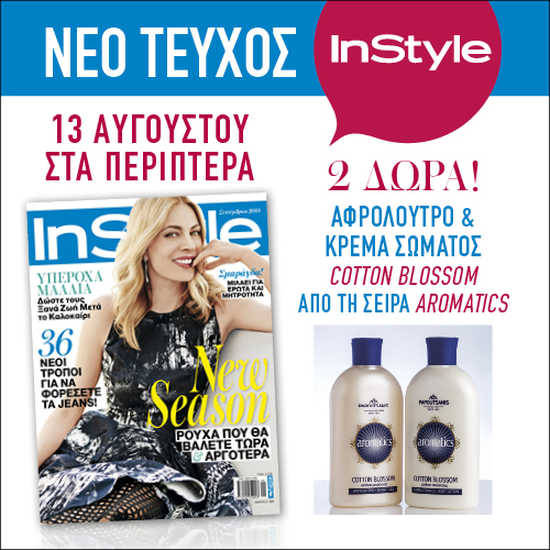 Ευχάριστα νέα για τις φανατικές InStyle αναγνώστριες καθώς απομένουν δύο μέρες για την κυκλοφορία του νέου InStyle. Το τεύχος Σεπτεμβρίου κυκλοφορεί την Τετάρτη 13 Αυγούστου με εξώφυλλο την Σμαράγδα Καρύδη και δύο δώρα μόνο για εσάς: ένα αφρόλουτρο & μία κρέμα σώματος Cotton Blossom από τη σειρά Aromatics.