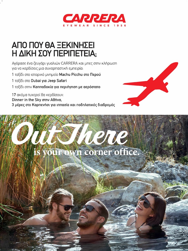 H CARRERA διοργανώνει τον πιο «OUT THERE» διαγωνισμό δίνοντας την ευκαιρία σε όσους συμμετάσχουν να ζήσουν μια μοναδική συναρπαστική εμπειρία. Συγκεκριμένα, από τις 29 Μαΐου έως τις 10 Ιουλίου, με την αγορά ενός ζευγαριού γυαλιών CARRERA, οι καταναλωτές μπαίνουν σε κλήρωση που θα αναδείξει 20 συνολικά νικητές.
