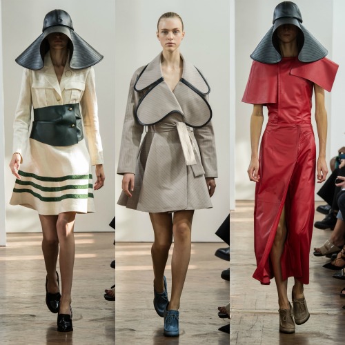 Γιατί μας άρεσε: Λατρεύουμε να βλέπουμε ρούχα που είναι απολύτως φορέσιμα και ταυτόχρονα διαθέτουν και πολύ ξεχωριστές λεπτομέρειες που τα διαφοροποιούν από το σύνολο. Φυσικά δεν μπορούμε να μην αναφερθούμε στο συγκεκριμένο καπέλο, που συνόδευε πολλά από τα σύνολα, το οποίο, αν και όχι ιδιαίτερα πρωτότυπο, οφείλουμε να ομολογήσουμε πως ήταν πραγματικά ενδιαφέρον. Οι γιακάδες, τα κουμπιά αλλά και η προσθήκη του δέρματος με έναν αναπάντεχο τρόπο, αναμφισβήτητα τράβηξαν την προσοχή μας, ενώ το ασημί τσόκερ που έμοιαζε με κομμάτι από παζλ, είναι το αξεσουάρ που μαντεύουμε πως θα αγαπηθεί περισσότερο από οτιδήποτε την επόμενη άνοιξη.