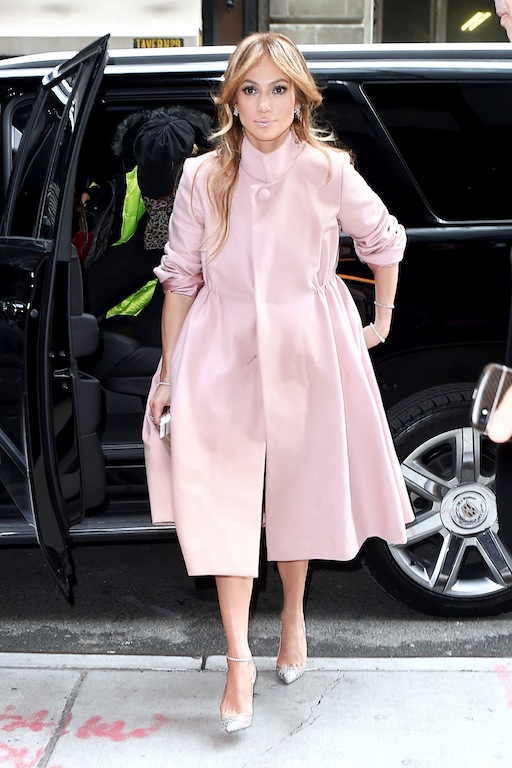 Η Jennifer Lopez πραγματοποίησε μία από τις πιο κομψές εμφανίσεις της για να δώσει το παρών στην εκπομπή Live with Kelly and Michael, με σκοπό να προωθήσει τη νέα της ταινία The Boy Next Door. Η όμορφη τραγουδίστρια και ηθοποιός επέλεξε ένα ροζ παλτό, με όρθιο γιακά Reem Acra -που άνοιγε από τη μέση και κάτω- το οποίο συνδύασε με γόβες διακοσμημένες με λαμπερά κρύσταλλα Christian Louboutin.