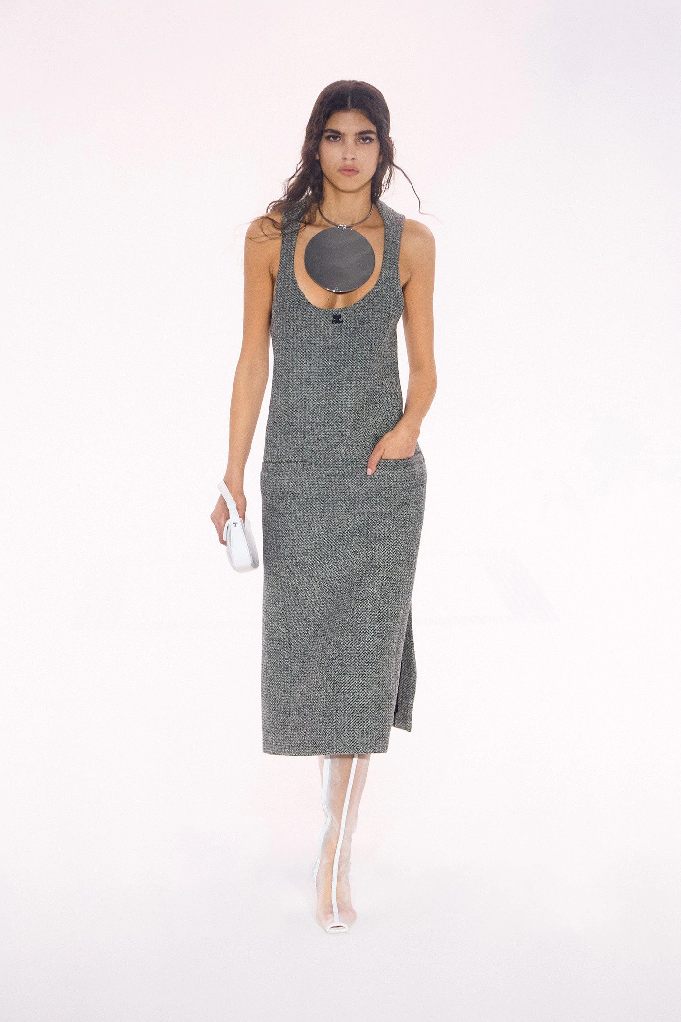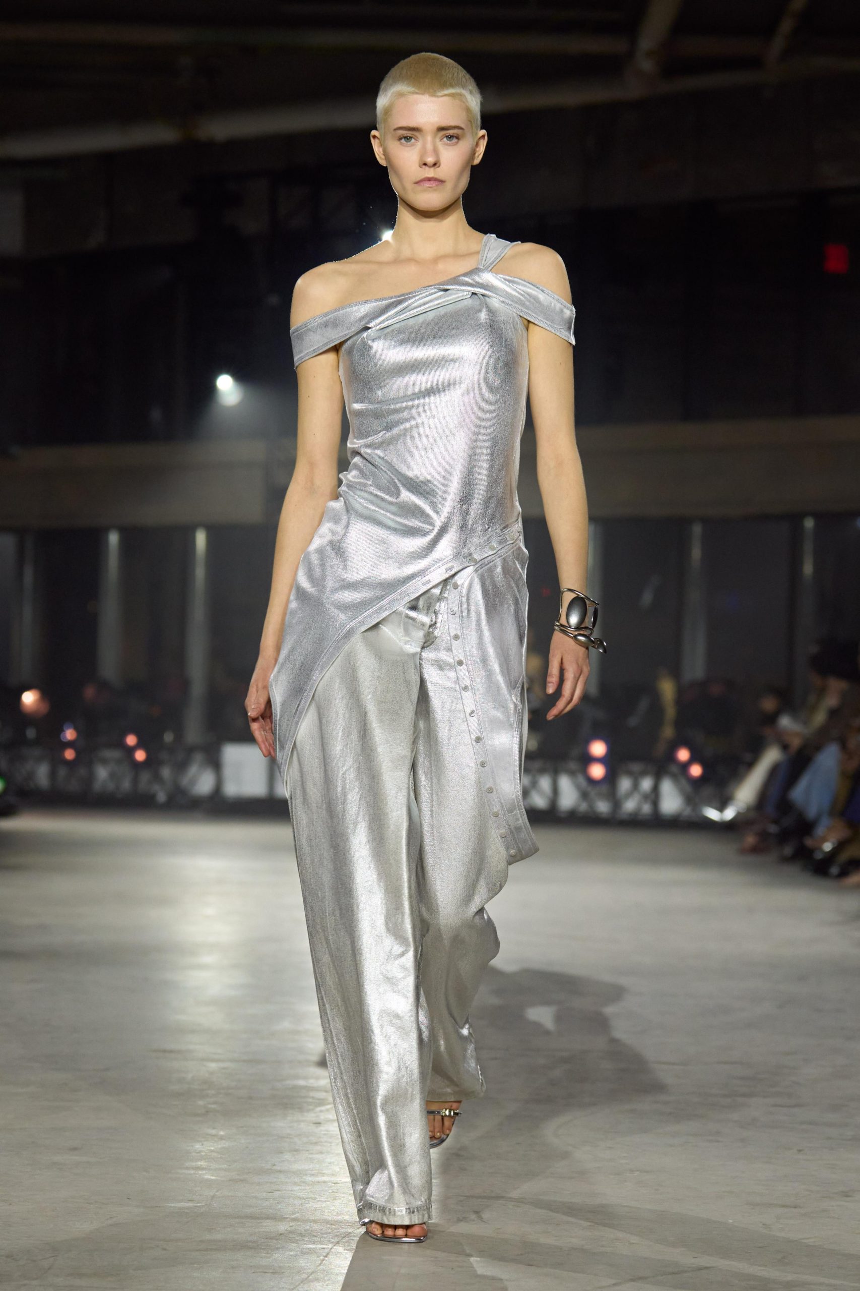 Στον Coperni, υπήρχαν ιδιαίτερες καρφίτσες, όπως μια εντυπωσιακή χοντροκομμένη από ασήμι σε σχήμα χεριού που τσιμπούσε το αριστερό στήθος ενός μοντέλου και δημιουργούσε ζάρες στο πλεκτό πουλόβερ που φορούσε.
