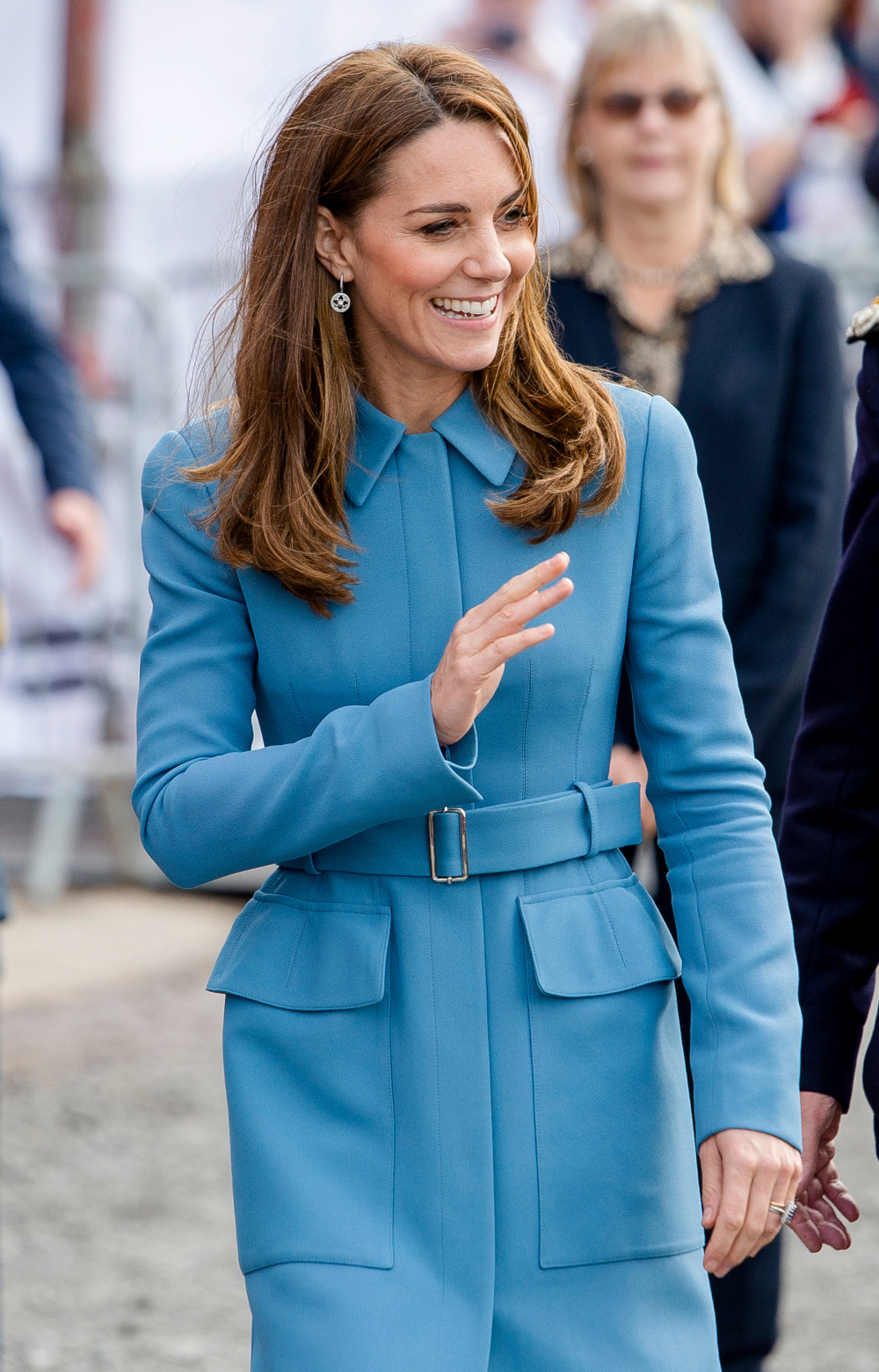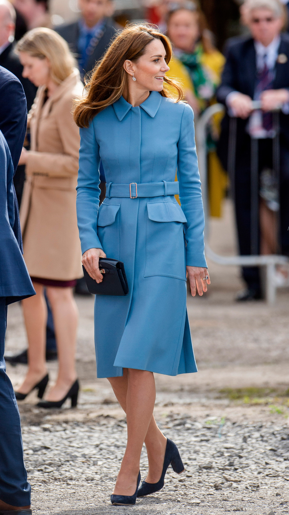 Η Kate συνδύασε το αγαπημένο της coat dress με ένα ζευγάρι suede γόβες σε μπλε απόχρωση και τετράγωνο τακούνι, ένα εξίσου μπλε clutch και λαμπερά κοσμήματα.