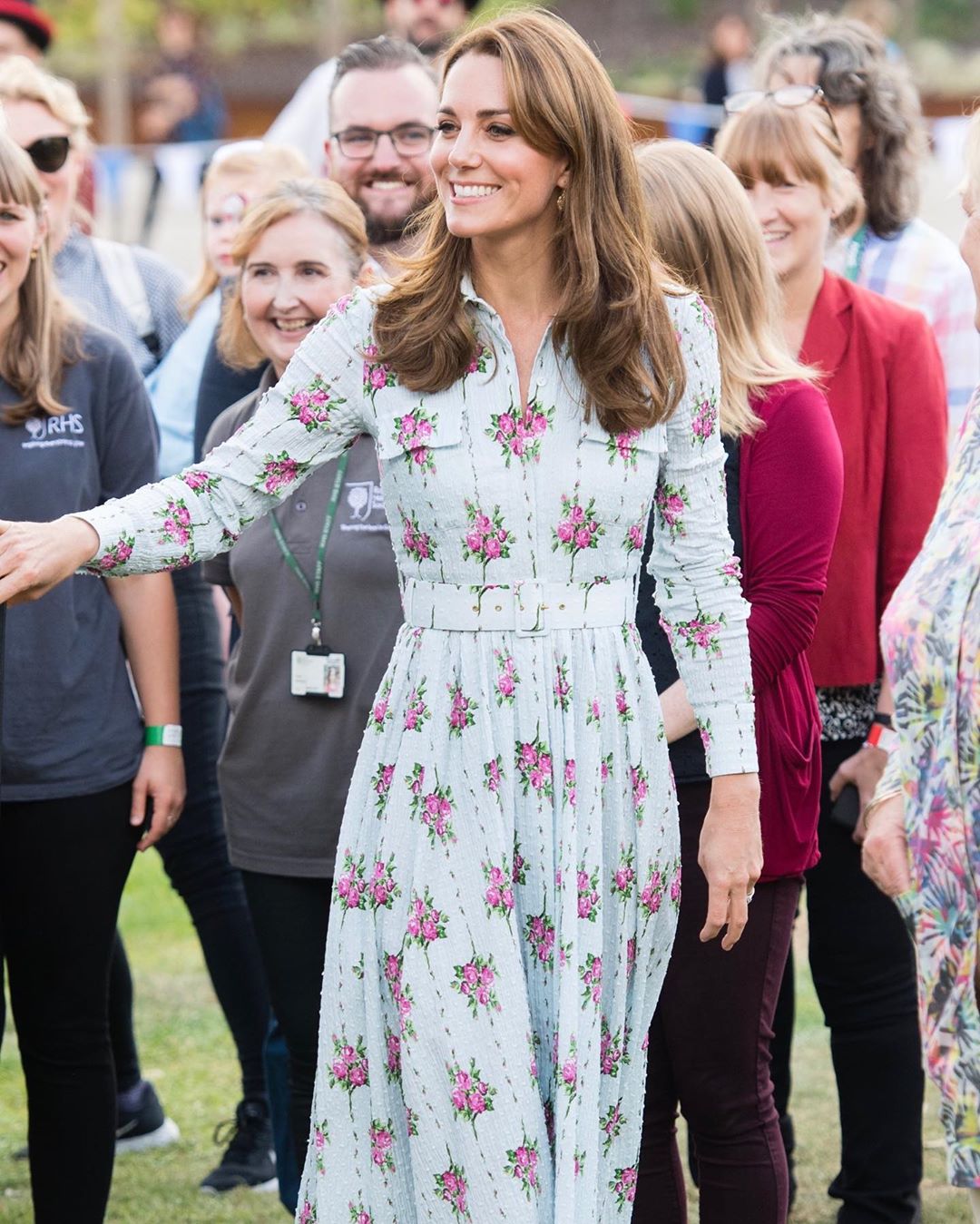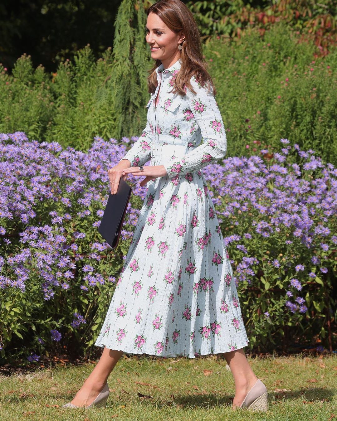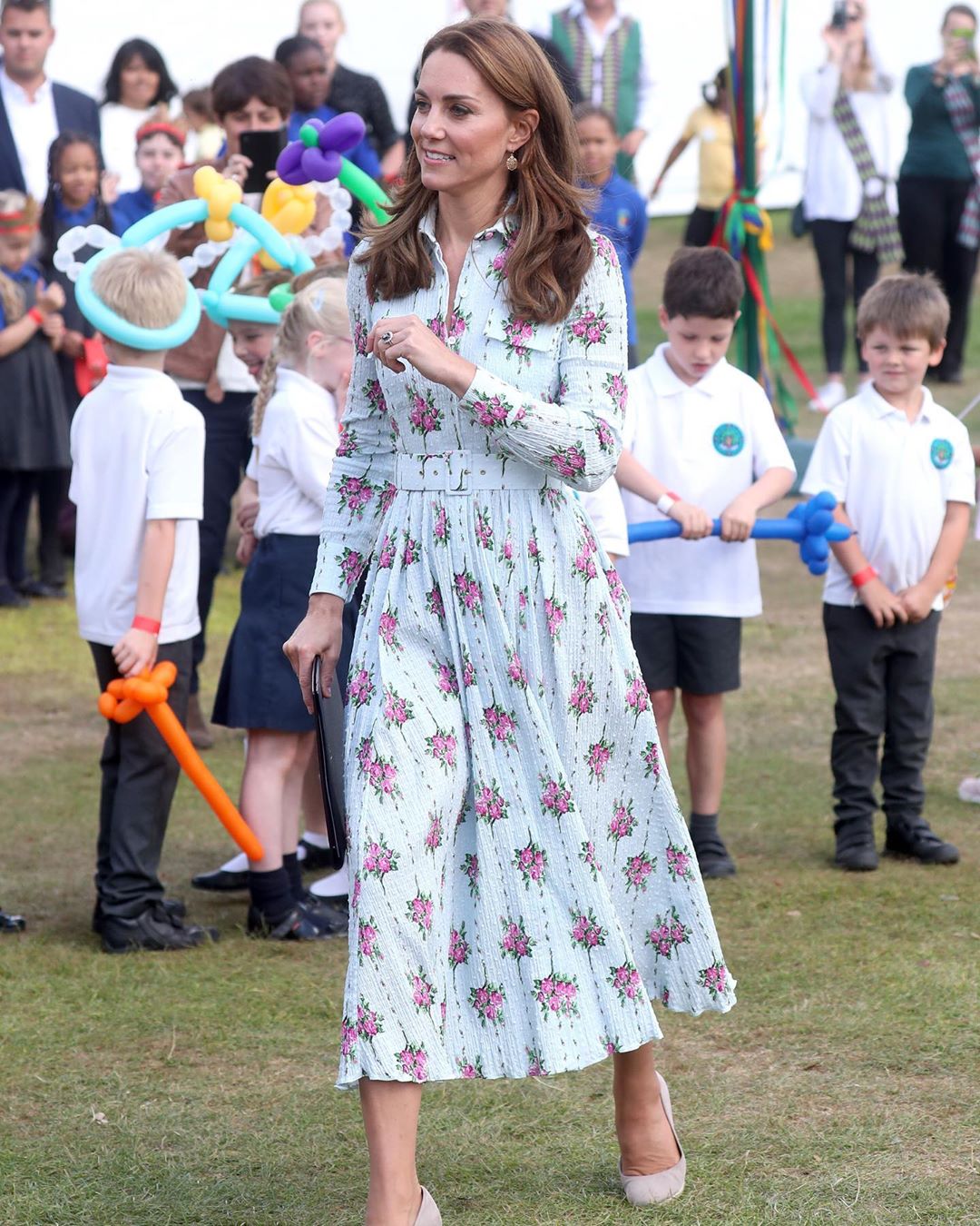 Σε αυτή την περίσταση, η Kate Middleton επέλεξε να φορέσει ένα midi φόρεμα της σχεδιάστριας Emilia Wickstead διακοσμημένο με λουλούδια και το συνδύασε με ένα ζευγάρι ψηλοτάκουνες nude εσπαντρίγιες.