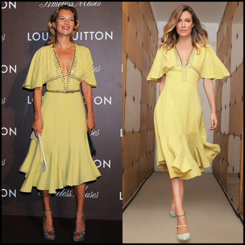 Με το που είδαμε την Βίκυ Καγιά στη νέα φωτογράφηση του In Style συνειδητοποιήσαμε ότι αυτό το κίτρινο φουστάνι με τα μανίκια καμπάνα και τις διακοσμητικές λεπτομέρειες στο μπούστο κάτι μας θύμιζε. Οπότε αρχίσαμε να ψάχνουμε τα κοιτάπια μας και βρήκαμε ότι το ίδιο ακριβώς φόρεμα -ένα Louis Vuitton Resort 2014– το είχε φορέσει και η Kate Moss πριν μερικούς μήνες για να δώσει το παρών στην έκθεση της φίρμας Louis Vuitton στο Τόκιο με τίτλο Timeless Muses. Χωρίς να θέλουμε να υποτιμήσουμε ούτε λεπτό το παγκόσμιο fashion icon, πιστεύουμε ότι όχι μόνο ταιριάζει περισσότερο στη Βίκυ Καγιά αλλά το έχει συνδυάσει και καλύτερα. Ενώ η Moss διάλεξε να το ταιριάξει με γκρι πέδιλα από το γαλλικό οίκο η Καγιά προτίμησε να ολοκληρώσει το look με παστέλ βεραμάν γόβες -με κίρινα και γαλάζια λουράκια -που δίνουν ένα πιο φρέσκο αέρα στο look. Last but not least το απαλό make-up της Ελληνίδας καλλονής και το αέρινο χτένισμά της δείχνουν σαφώς πιο αρμονικά με το ανοιξιάτικο outfit.