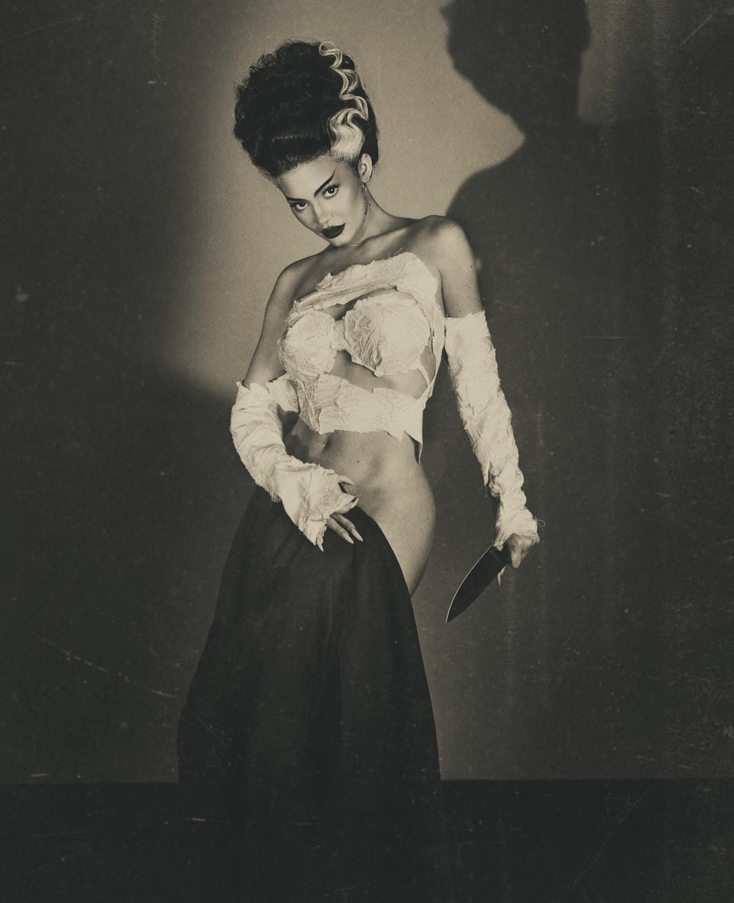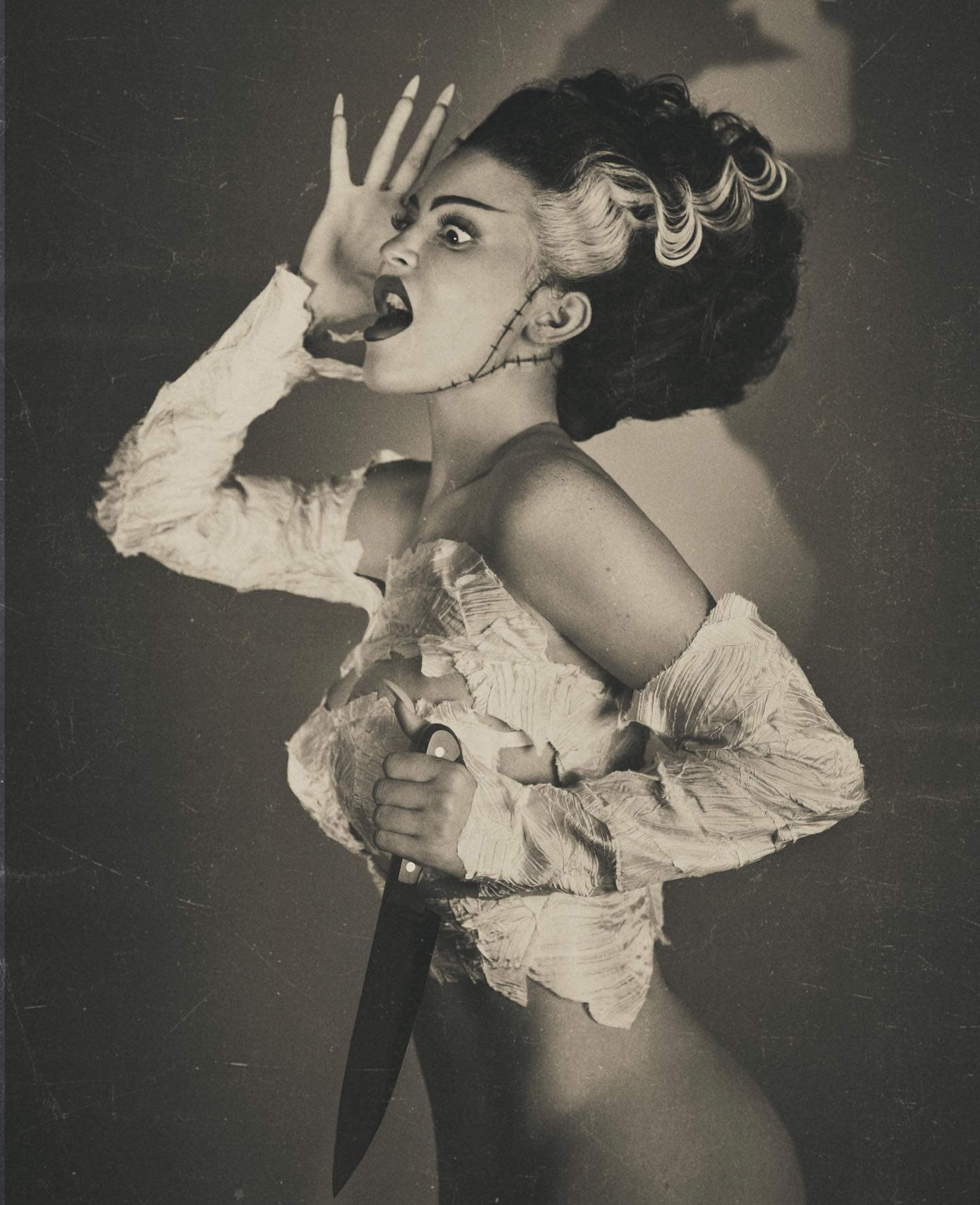 Βέβαια, το κορμί της ήταν τυλιγμένο με λευκές γάζες και σε κάποιες φωτογραφίες πόζαρε γυμνή από τη μέση και κάτω ενθουσιάζοντας τους θαυμαστές της, που έσπευσαν να σχολιάσουν ότι πρώτη φορά βλέπουν τόσο σέξι τη “νύφη του Φρανκενστάιν”.