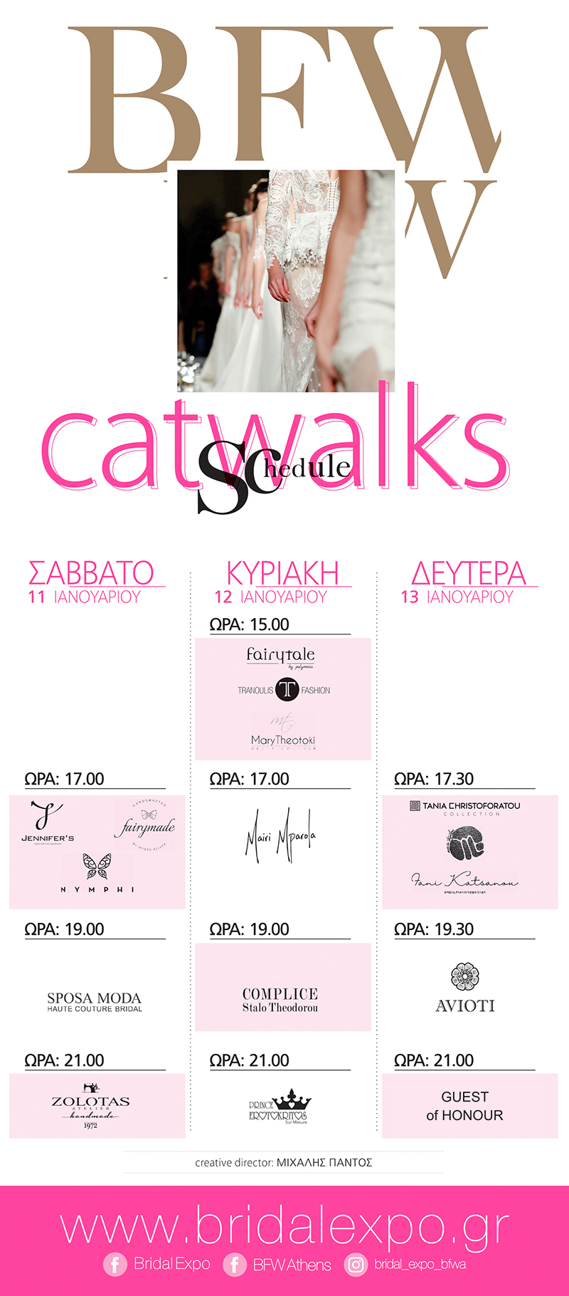 Παράλληλα με την Bridal Expo διοργανώνεται και συλλειτουργεί στο Ζάππειο η Bridal Fashion Week, η μοναδική στην Ελλάδα Εβδομάδα Μόδας του γάμου, υπό την καλλιτεχνική διεύθυνση του fashion expert, Μιχάλη Πάντου. Οι εταιρίες που θα υποστηρίξουν τη BFW 2020 είναι η σχολή FREDDY MAKE UP STAGE στο make up και στο hairstyling, NYXI – NYXI στο nail sponsoring, TSAKIRIS MALLAS, MIGATO shoe sponsors, και η σχολή μόδας PAN SIK.