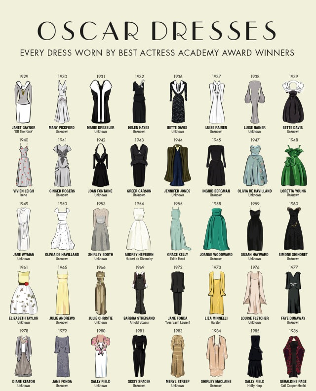 Τα συγκεκριμένα σκίτσα που κυκλοφορούν τις τελευταίες ώρες στο διαδίκτυο απεικονίζουν ακριβώς αυτό: κάθε μα κάθε φόρεμα που έχει φορεθεί από την εκάστοτε νικήτρια του Α’ Γυναικείου Ρόλου. Σε μερικά βέβαια το label είναι άγνωστο, δεν παύουν όμως να έχουν μεγάλο ενδιαφέρον και να μας μεταφέρουν σε εκείνα τα χρόνια.