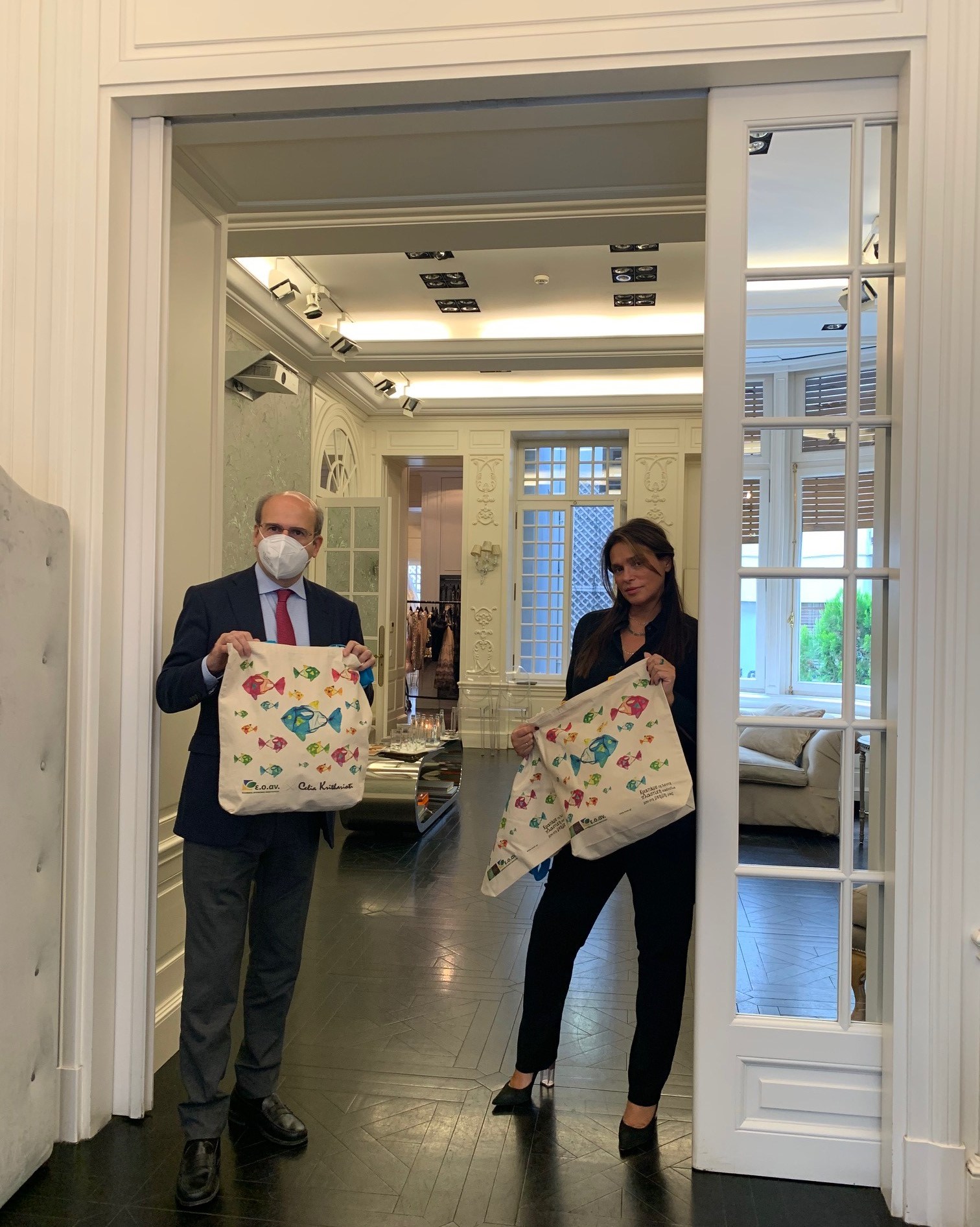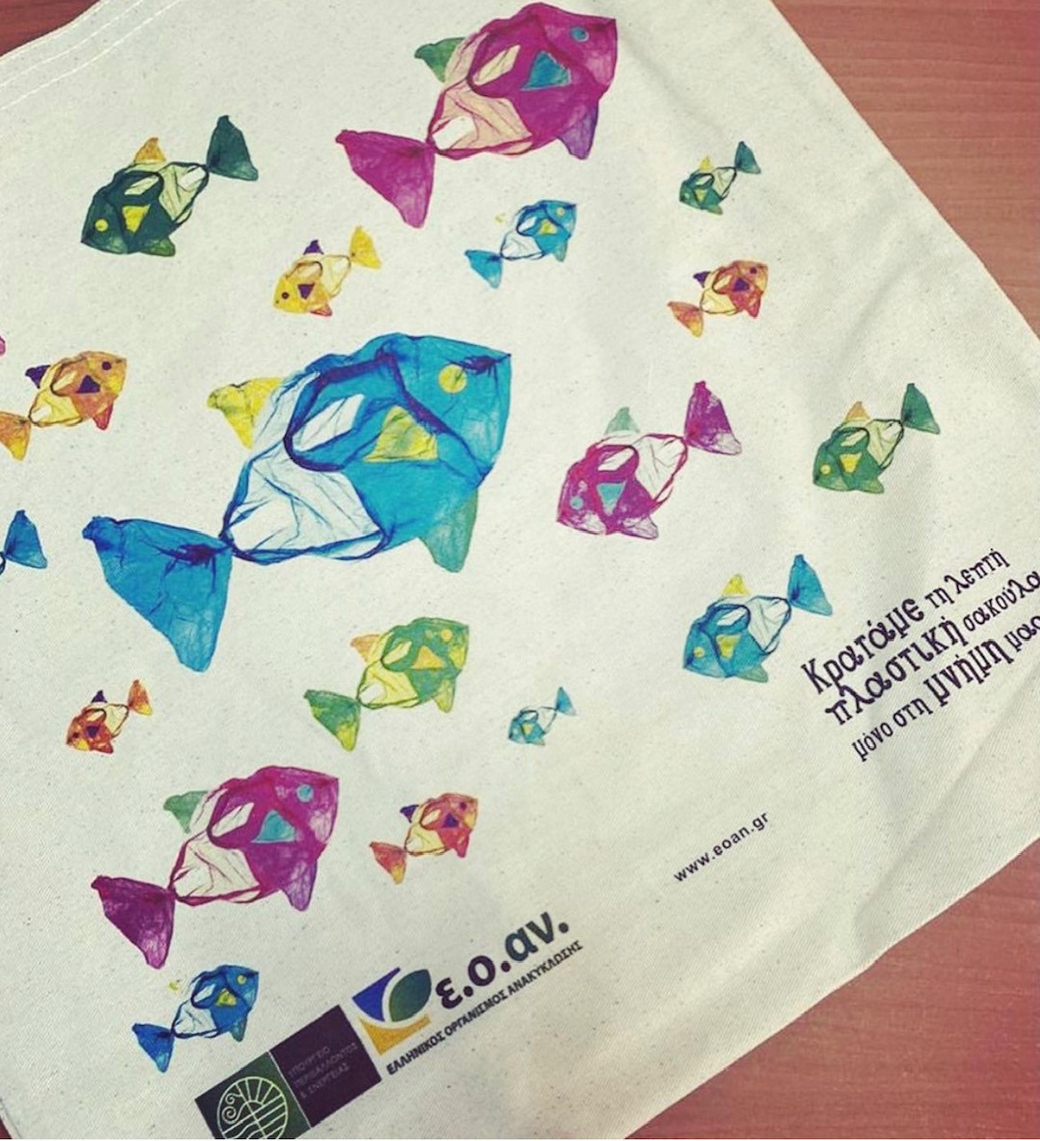 Στις πάνινες τσάντες που πρόκειται να διανεμηθούν το προσεχές διάστημα, στα 3.5 εκατομμύρια σπίτια σε όλη την χώρας, θα αξιοποιηθεί το σχέδιο που είχε δημιουργήσει το 2018 η διεθνούς φήμης Ελληνίδα σχεδιάστρια μόδας, Σίλια Κριθαριώτη. Οι τσάντες αυτές, με ζωγραφισμένα ψάρια με σώματα καλυμμένα από πλαστικές σακούλες, συμβάλλουν στην περιβαλλοντική συνείδηση, σε μια προσπάθεια να καταργηθεί η χρήση της πλαστικής σακούλας.
