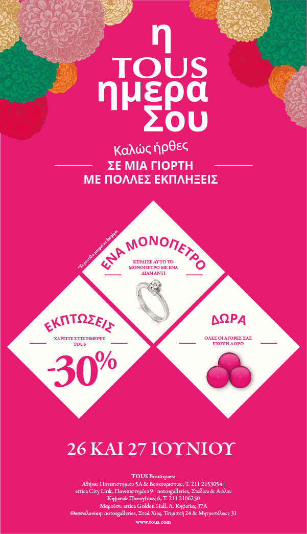 Μόνο για την Πέμπτη 26 και την Παρασκευή 27 Ιουνίου, θα ισχύει μεταξύ άλλων έκπτωση 30% σε πάρα πολλά είδη, ενώ όλοι οι επισκέπτες, ανεξαρτήτως αγορών, συμμετέχουν στη μεγάλη κλήρωση με έπαθλο ένα διαμαντένιο μονόπετρο TOUS. Επιπλέον: