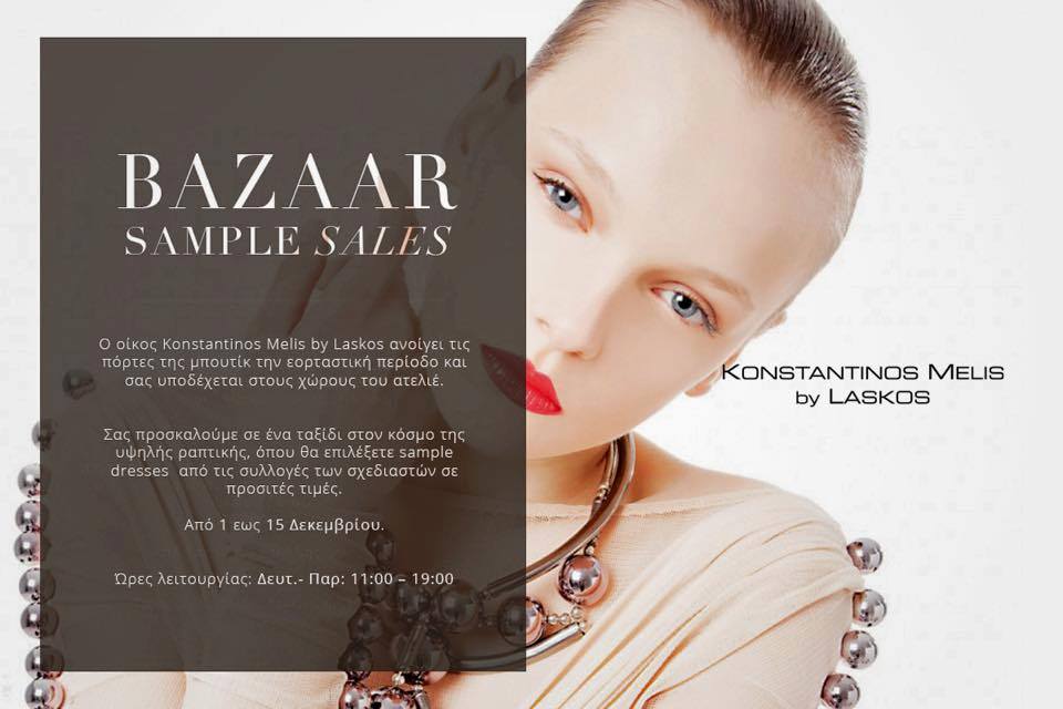 Αυτά τα Χριστούγεννα, το δίδυμο που βρίσκεται πίσω από τον οίκο Konstantinos Melis by Laskos, φέρνει το χριστουγεννιάτικο πνεύμα με ένα Sample Sales Bazaar. To υψηλών προδιαγραφών bazaar μόδας, θα ξεκινήσει στη 1 Δεκεμβρίου και θα τελειώσει στις 15 του μήνα. Ο κόσμος θα μπορεί ναεπισκέπτεται το ατελιέ των σχεδιαστών εκείνες τις ημέρες, από τις 11 π.μ. μέχρι τις 7 μ.μ. και θα έχει την ευκαιρία να αγοράζει sample dresses από τις συλλογές των σχεδιαστών, με έως 80% έκπτωση.