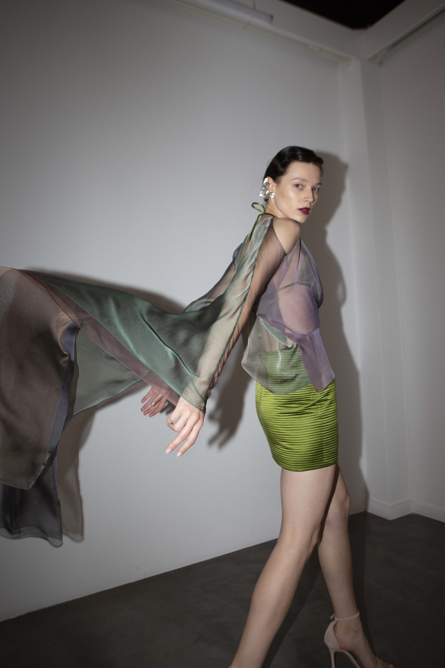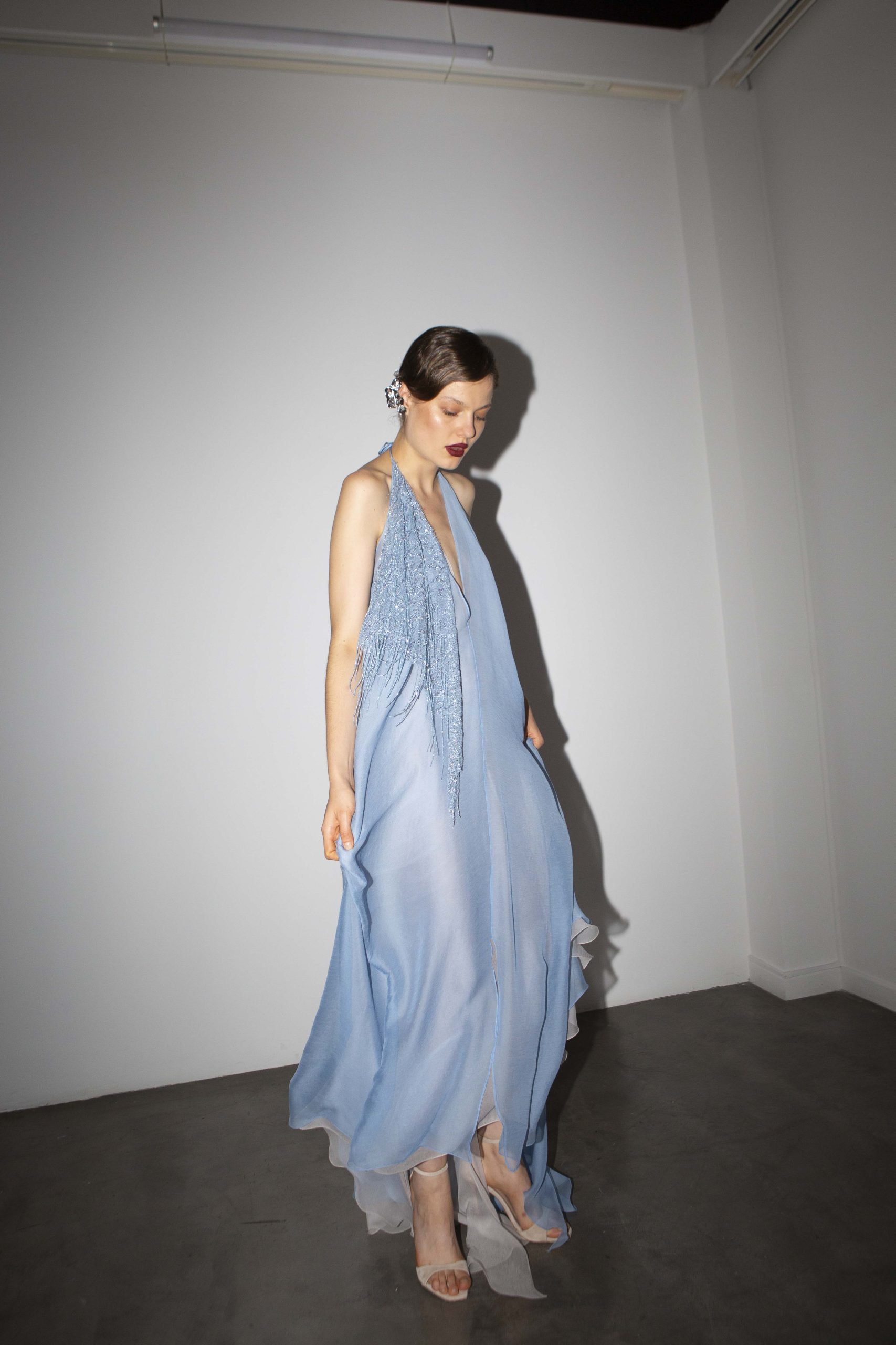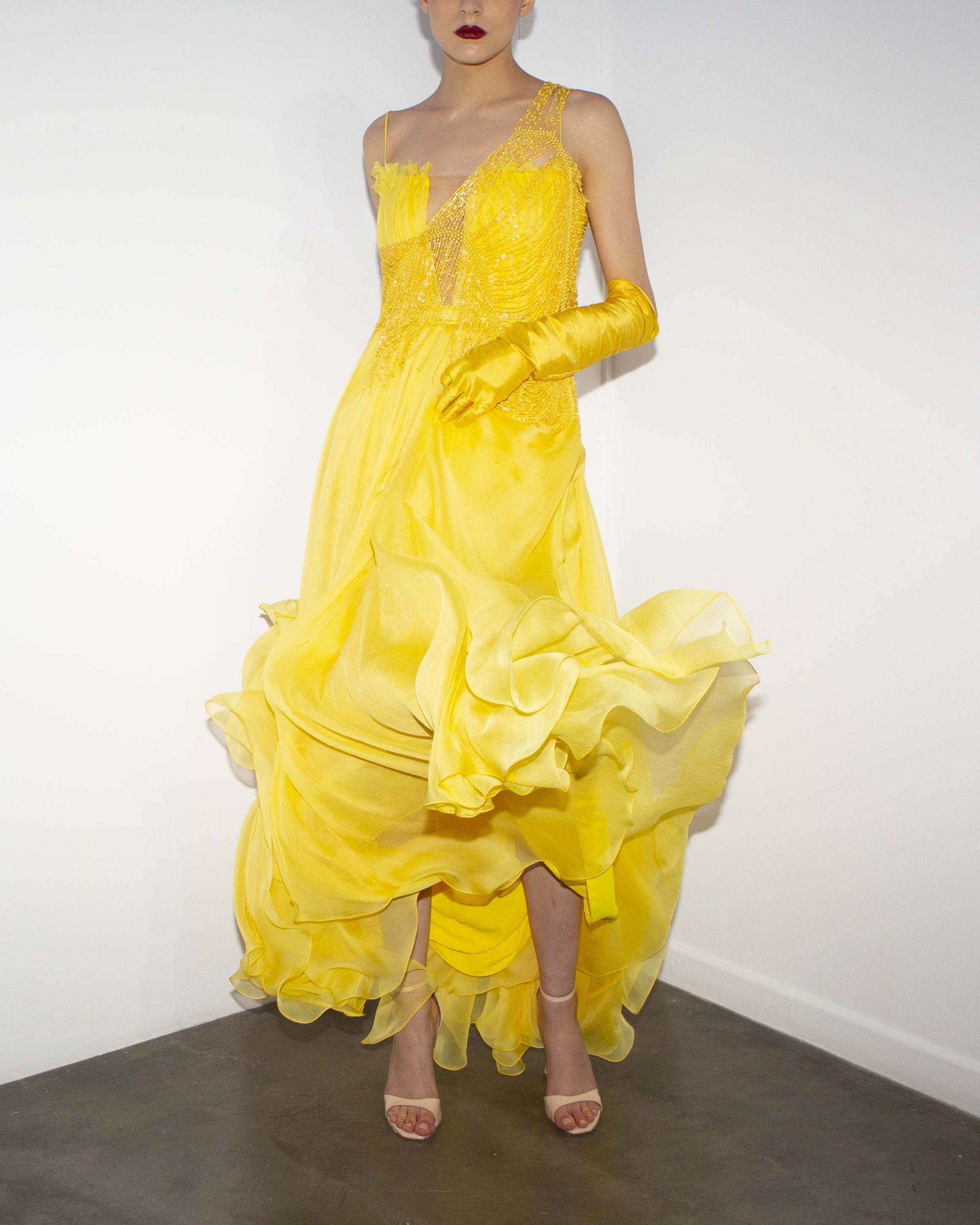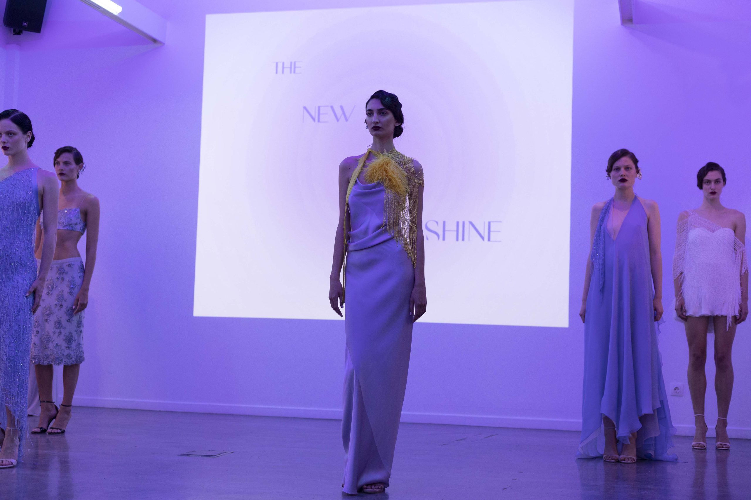 Ο χώρος της γκαλερί φωτιζόταν από το video projection του νέου λογότυπου και από τα κίτρινα φώτα που σήμαναν την αρχή του act: Επτά μοντέλα εμφανίστηκαν με δύο διαφορετικά outfits το καθένα, συνδυασμένα τέλεια με κοσμήματα Theodora D, ενώ το peak της παρουσίασης ήταν ένα όγδοο μοντέλο που, σαν κινούμενο άγαλμα, κυρίευσε το χώρο με το δωρικό του περπάτημα. Ντυμένο με ένα κίτρινο φόρεμα, υπογράμμισε έτσι το χρώμα της νέας εταιρικής ταυτότητας. Ένα χρώμα-σύμβολο που φωτίζει το επόμενο κεφάλαιο του οίκου Liana Camba με τη δύναμη της αλλαγής, της διορατικότητας, της ελπίδας και της πνευματικότητας. Αυτός εξάλλου είναι και ο πυρήνας της νέας συλλογής για το καλοκαίρι.