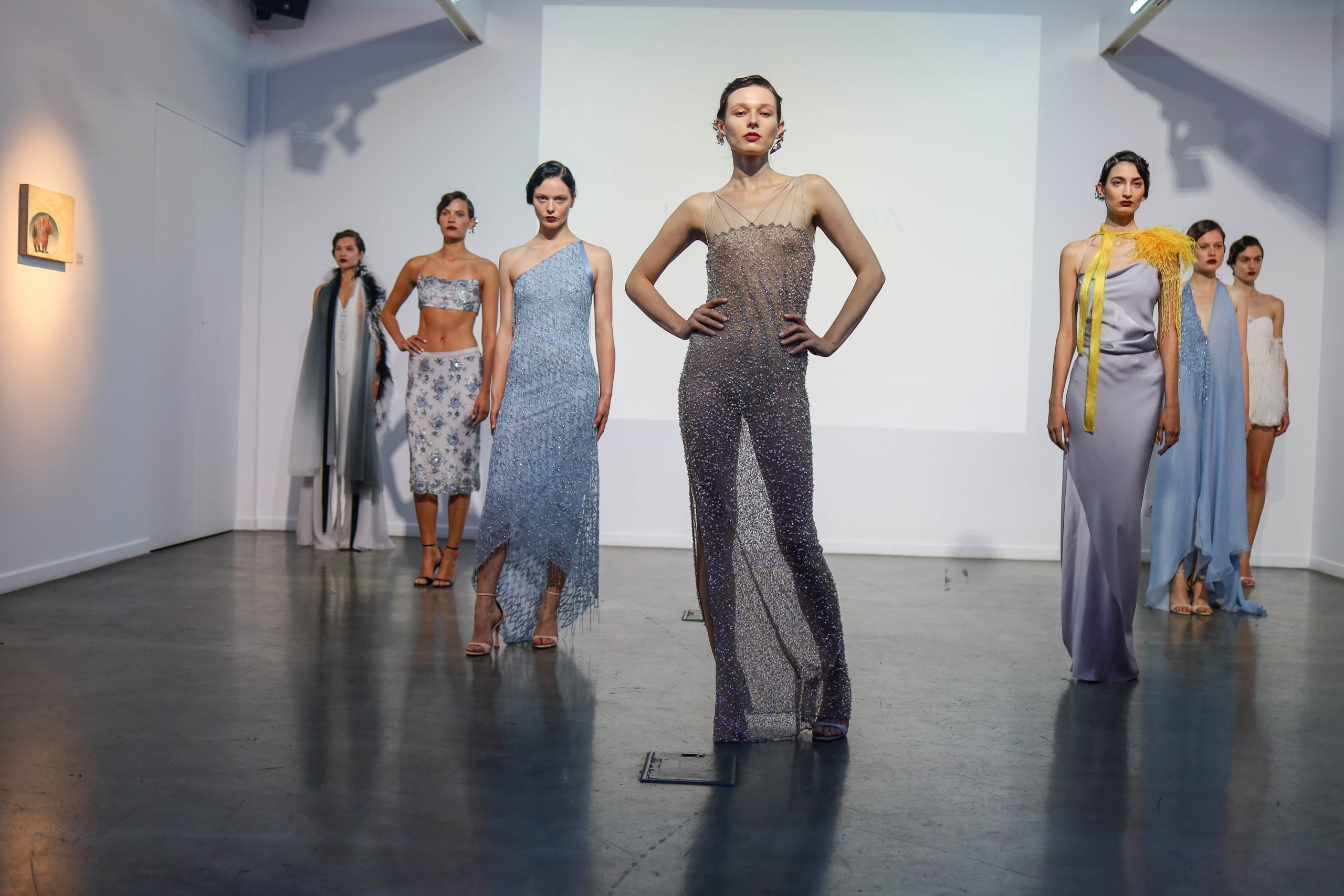 Ο χώρος της γκαλερί φωτιζόταν από το video projection του νέου λογότυπου και από τα κίτρινα φώτα που σήμαναν την αρχή του act: Επτά μοντέλα εμφανίστηκαν με δύο διαφορετικά outfits το καθένα, συνδυασμένα τέλεια με κοσμήματα Theodora D, ενώ το peak της παρουσίασης ήταν ένα όγδοο μοντέλο που, σαν κινούμενο άγαλμα, κυρίευσε το χώρο με το δωρικό του περπάτημα. Ντυμένο με ένα κίτρινο φόρεμα, υπογράμμισε έτσι το χρώμα της νέας εταιρικής ταυτότητας. Ένα χρώμα-σύμβολο που φωτίζει το επόμενο κεφάλαιο του οίκου Liana Camba με τη δύναμη της αλλαγής, της διορατικότητας, της ελπίδας και της πνευματικότητας. Αυτός εξάλλου είναι και ο πυρήνας της νέας συλλογής για το καλοκαίρι.