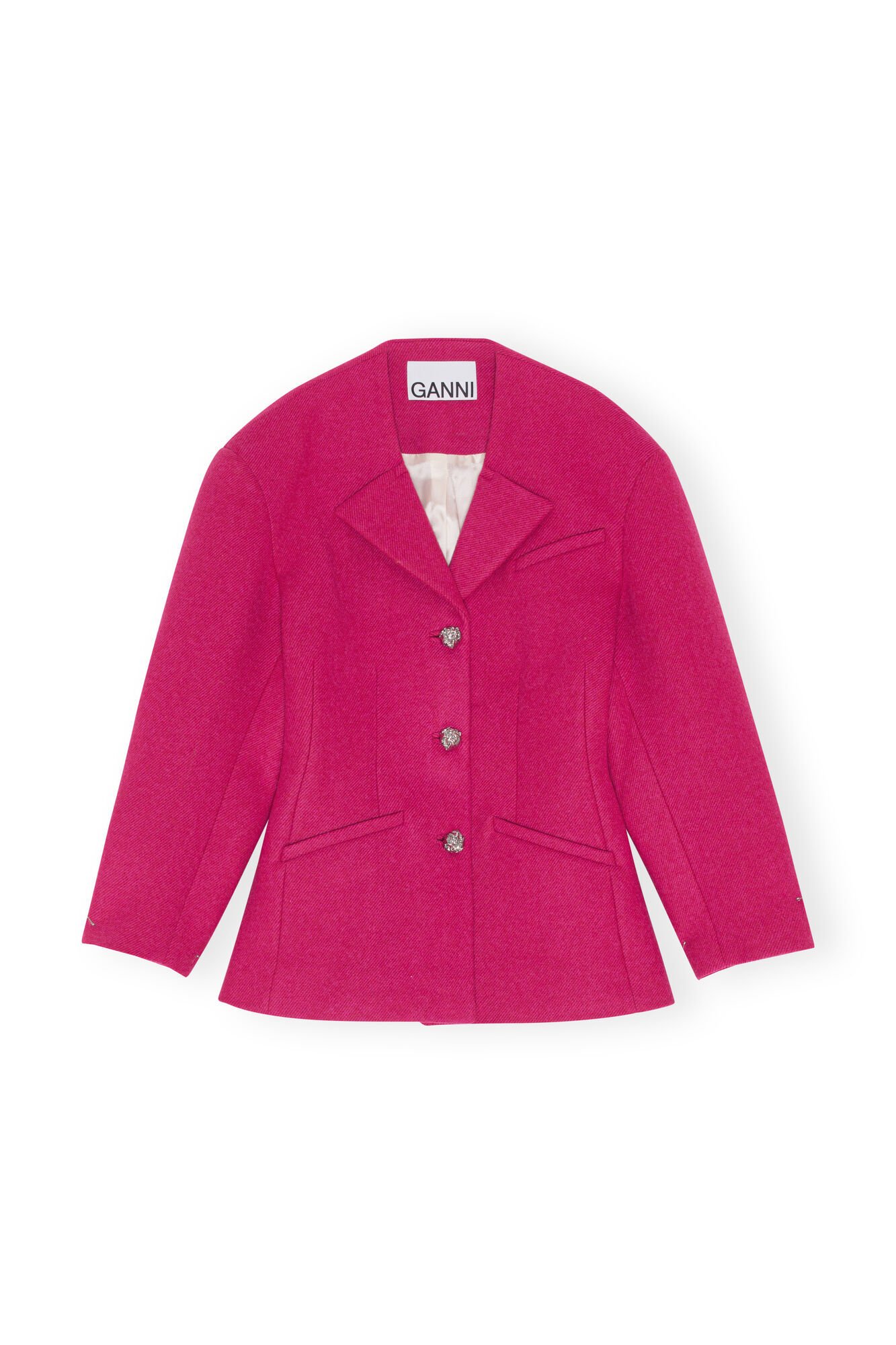 Το μάλλινο μπλέιζερ είναι κατασκευασμένο από 70% πιστοποιημένο ανακυκλωμένο μαλλί μετά την κατανάλωση. Διαθέτει γιακά, λαιμόκοψη σε σχήμα V, πεσμένους ώμους, διακοσμητικές τσέπες ,διακριτικά μανίκια με κουκούλι και τρία ασημένια κουμπιά – Ganni