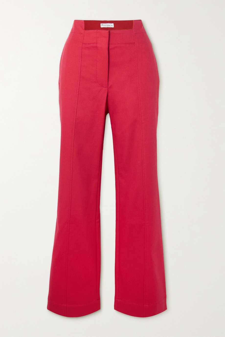 Γυναικείο παντελόνι, επενδεδυμένο με πτυχές στα ίσια πόδια και με μια οδοντωτή ζώνη χαμηλού ύψους. Τα κομμένα στριφώματα λειτουργούν καλά με τα μποτάκια. JW Anderson