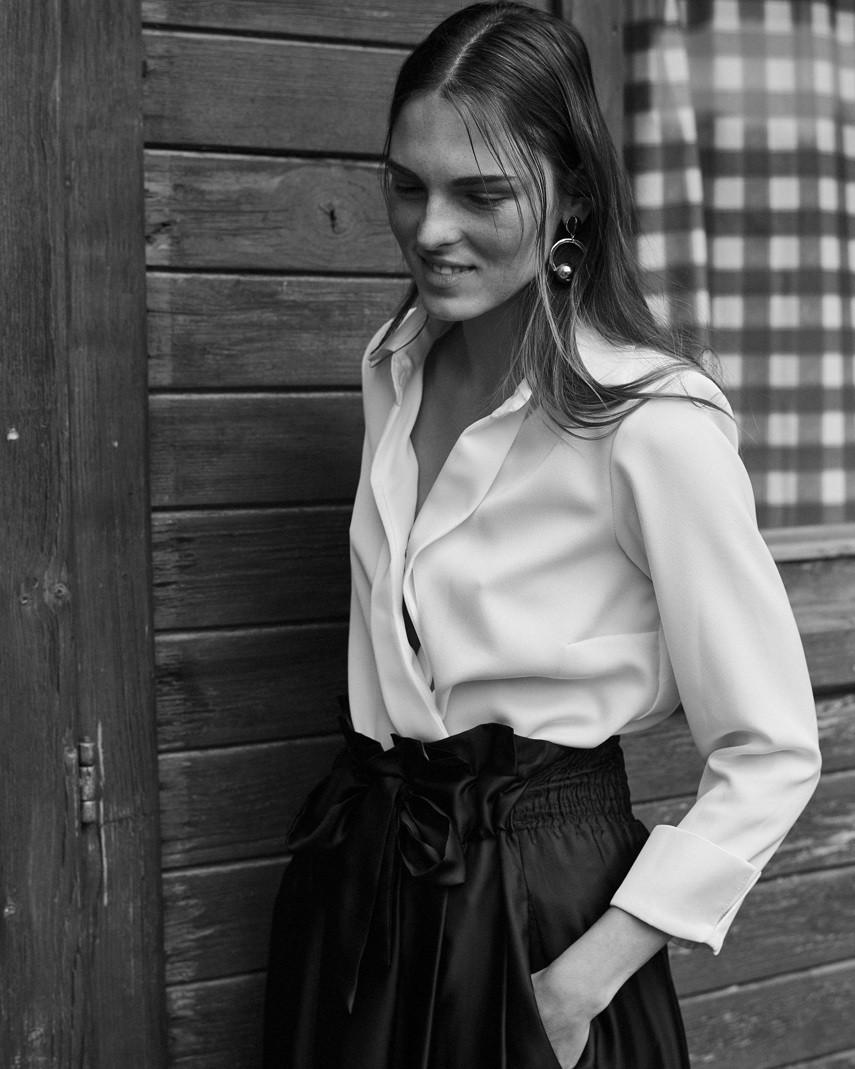 Με αέρα που θυμίζει 1980s αυτή η σατέν μπλούζα με τους έντονους ώμους, είναι ιδανική για τις πιο δροσερές βραδιές του καλοκαιριού.