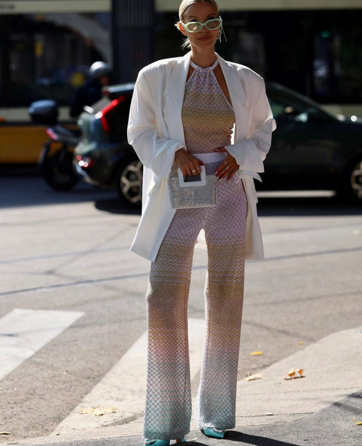 Rainbow Suit: παίζοντας στη soft παλέτα του ουράνιου τόξου και φορώντας ένα oversized λευκό σακάκι από πάνω, η Leonie Hanne εντυπωσιάζει με το φωτεινό στιλ της. Επιλέγοντας πάντα luxury αξεσουάρ, δεν ξεχνά να βάζει στα looks της μια νότα λάμψης -όπως το τσαντάκι της- η οποία αναδεικνύει ακόμα περισσότερο την λαμπερή της προσωπικότητα.