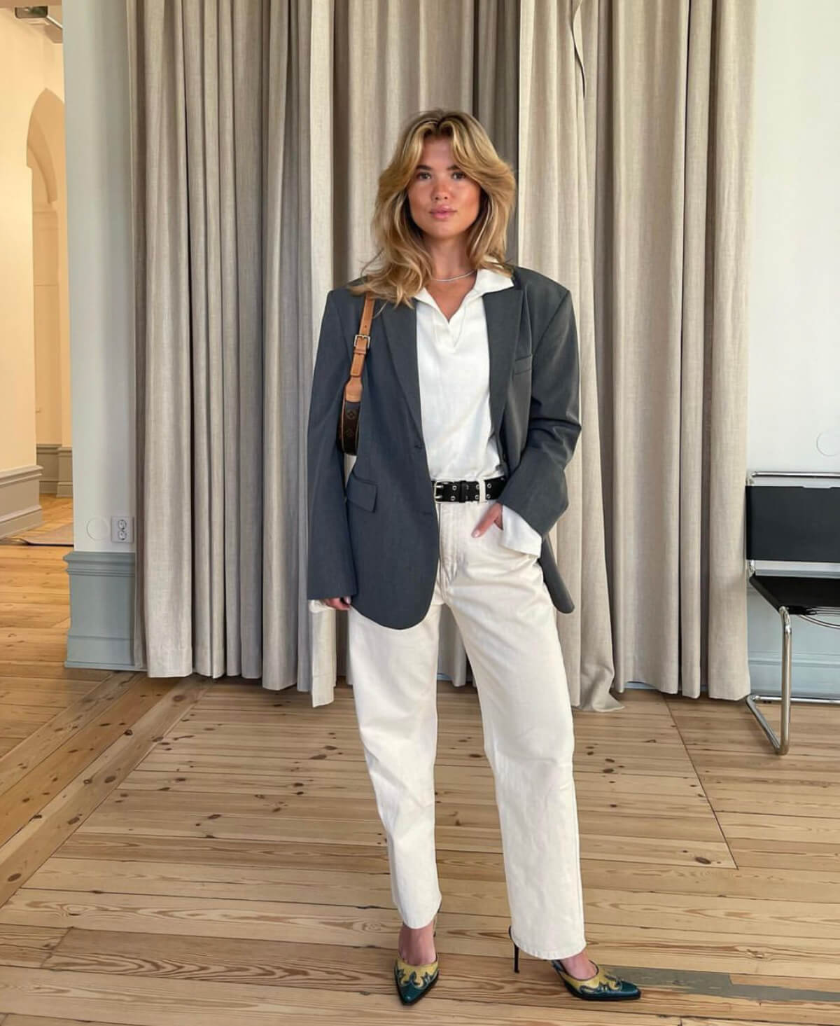 Statement office look: με βάση το λευκό και κάνοντας παιχνίδι με τα αξεσουάρ. Αν θέλετε να αντιγράψετε το στιλ τής fashion Matilda, τότε επιλέξτε παπούτσια και αξεσουάρ που φαινομενικά δεν ταιριάζουν με το αυστηρό look, αλλά τα οποία αποτελούν προσωπική σας υπογραφή.