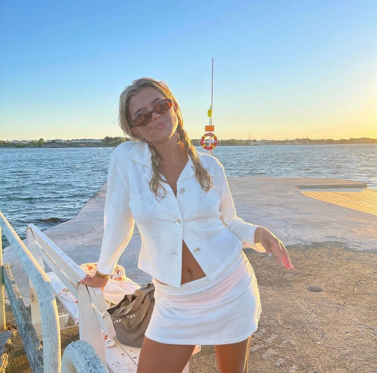 Total white, total mini: οι μικροσκοπικές φούστες που απετέλεσαν hot fashion item στις αρχές του 2000 κατέχουν μόνιμη θέση στη ντουλάπα και στην… καρδιά τής Matilda. Και με ένα επίσης λευκό shirt μας δίνει το πιο τέλειο look της παραλίας.