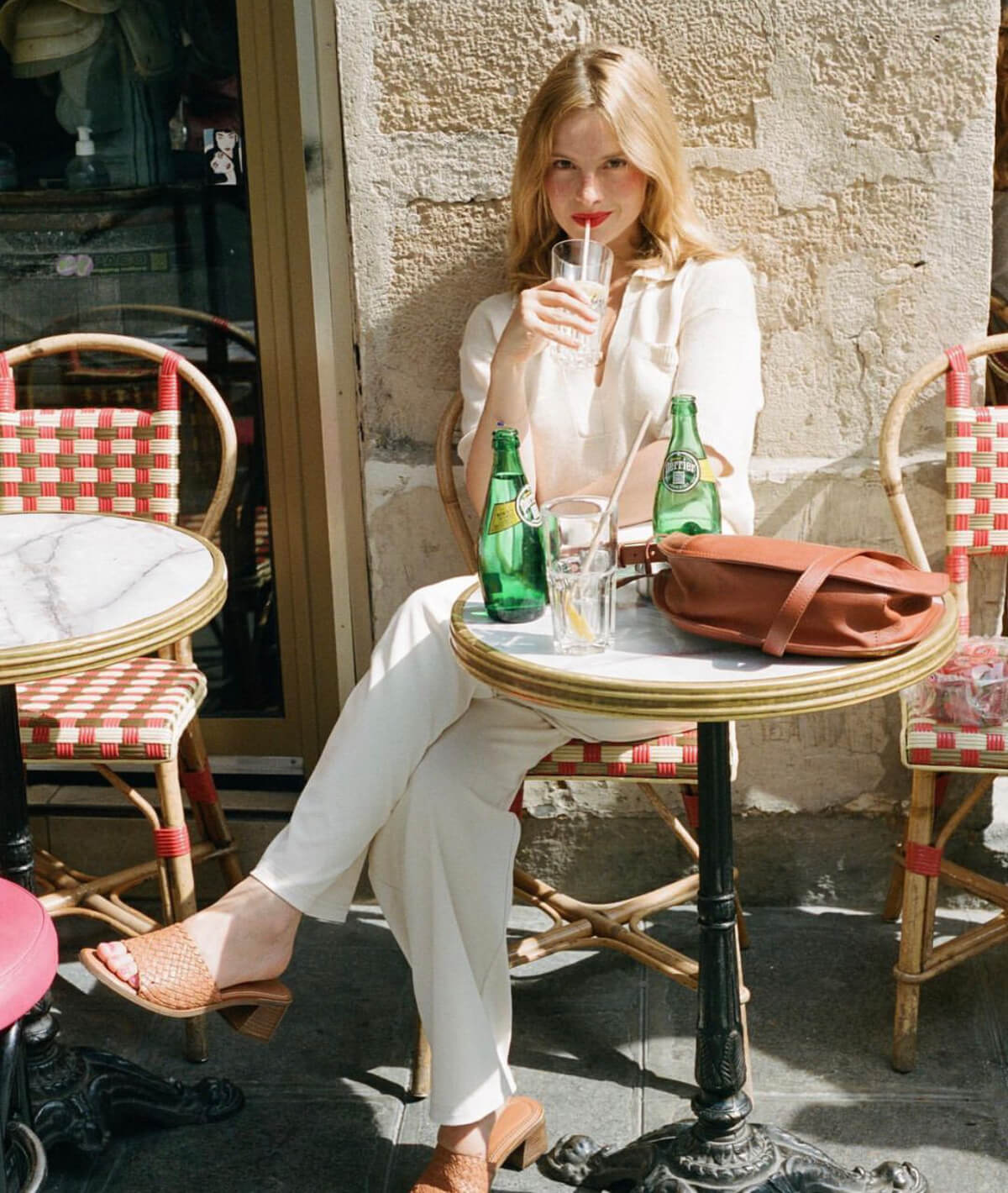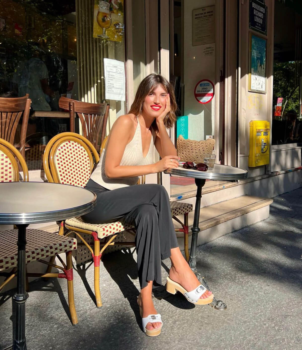Χυτή παντελόνα και nude χρώματα: ακόμα και σε λεπτό πλεκτό αποτελούν μια σοφιστικέ επιλογή, ειδικά όταν συνδυάζονται με vintage mules-τσόκαρα που είναι και τα αγαπημένα των Parisian girls.