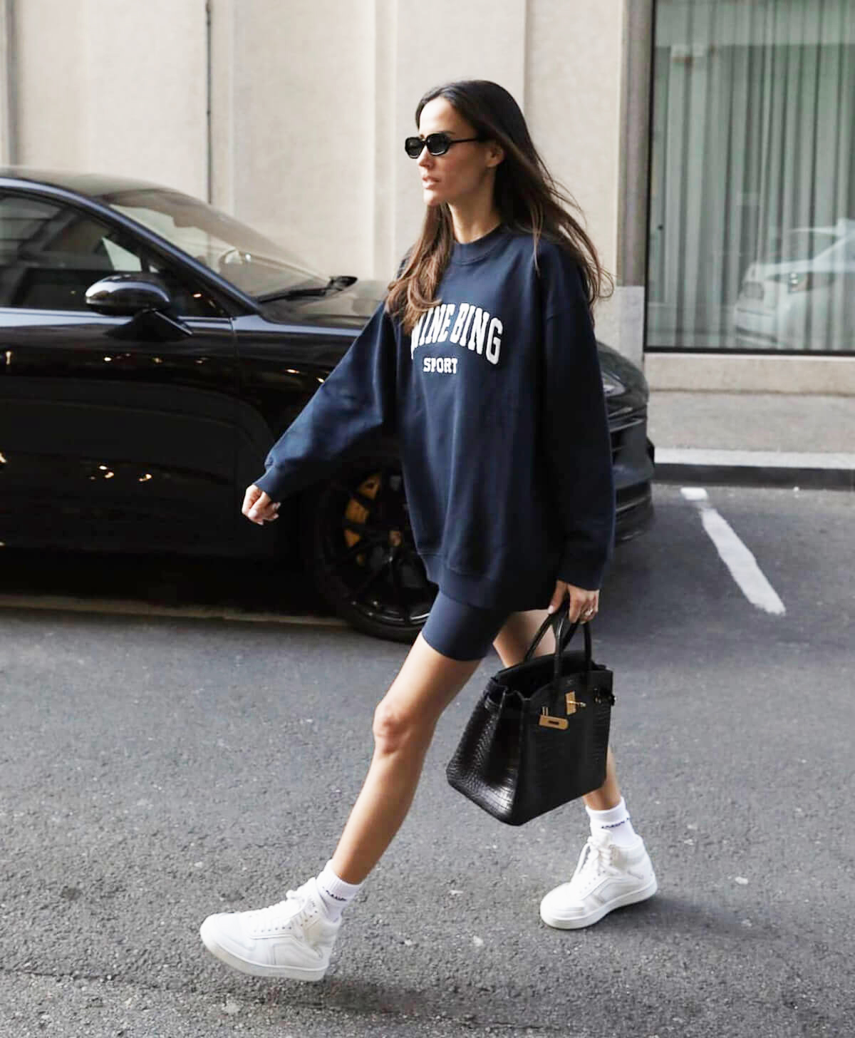 Δευτέρα με ποδηλατικό κολάν: σε navy blue αποχρώσεις για να ξεκινήσουμε την εβδομάδα μας με χρώμα! Συνδυάστε το με ένα oversized φούτερ για να αντιμετωπίσετε τη ψύχρα των πρώτων πρωινών ωρών, ένα ζευγάρι άνετα αθλητικά παπούτσια και μια statement αυστηρή τσάντα που θα διατηρήσει το off to work mood της Δευτέρας.