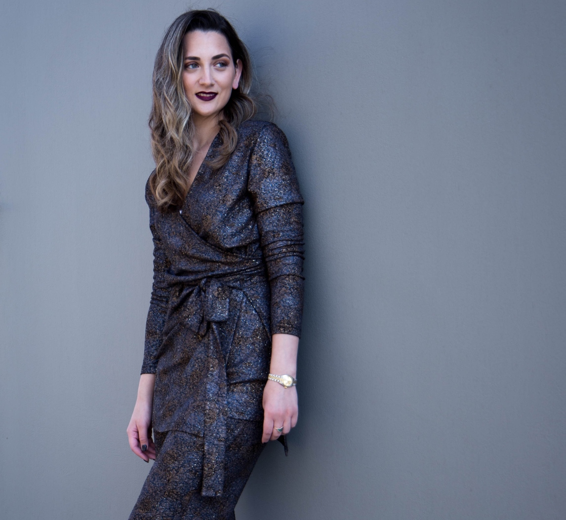 - Lurex πλεκτό φόρεμα, παλτό σύμφωνα με την χρωματική παλέτα που θα επιλέξεις, μπότες ή ankle boots.