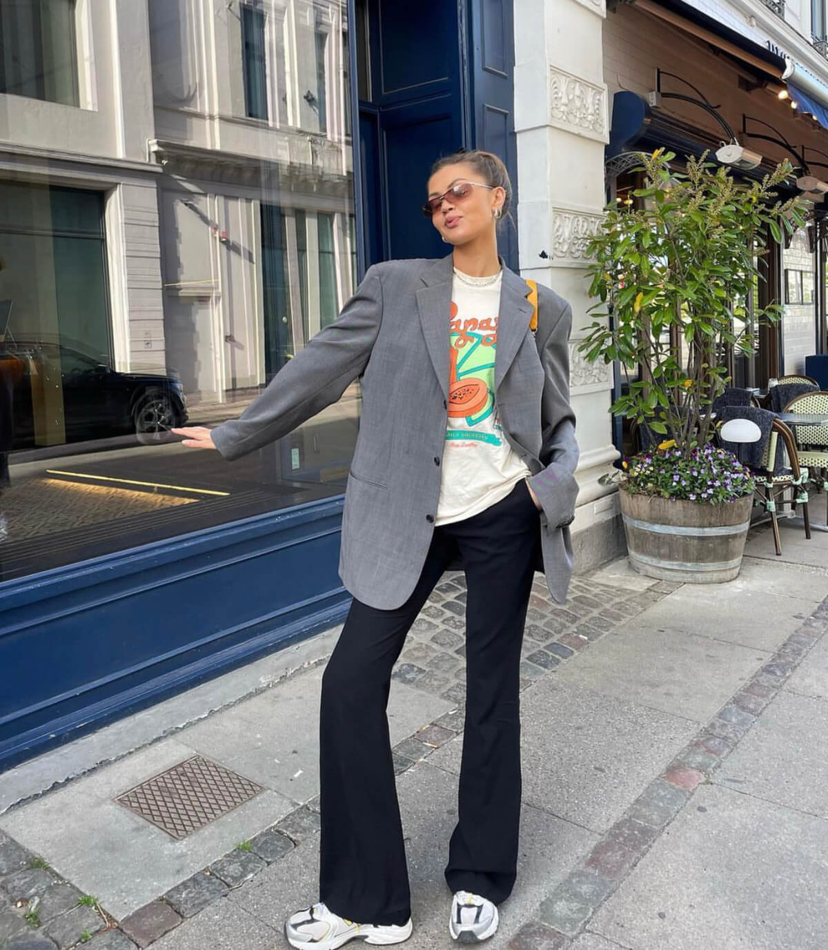 Office attire με αθλητική φόρμα: γίνεται; Κι όμως, γίνεται! Ειδικά όταν έχει τη μορφή καμπάνας και θυμίζει το κλασικό μαύρο παντελόνι. Αν διαθέτετε ένα τέτοιο fashion piece στη γκαρνταρόμπα σας, συνδυάστε το με ένα cool t-shirt σε oversized γραμμή κι ένα ανδρικό blazer και δημιουργήστε το πιο σύγχρονο office look.