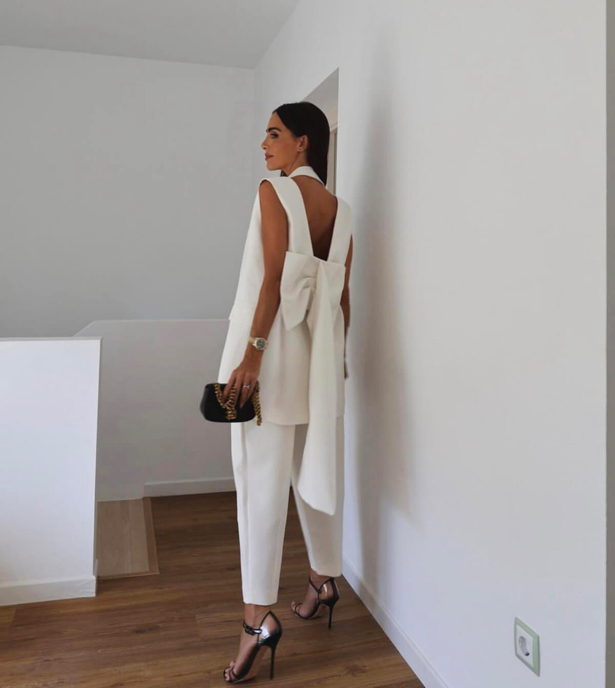 Επιλέξτε ένα διαφορετικό κοστούμι: δηλαδή όχι το κλασικό παντελόνι-σακάκι, αλλά ένα με διαφορετικό design, το οποίο δεν θα έχει καμία άλλη. Φυσικά, πρωταγωνιστής στο συγκεκριμένο look θα είναι και πάλι το λευκό παντελόνι, με λίγο έξτρα ενδιαφέρον ωστόσο, στο πάνω μέρος. Chic and clean.