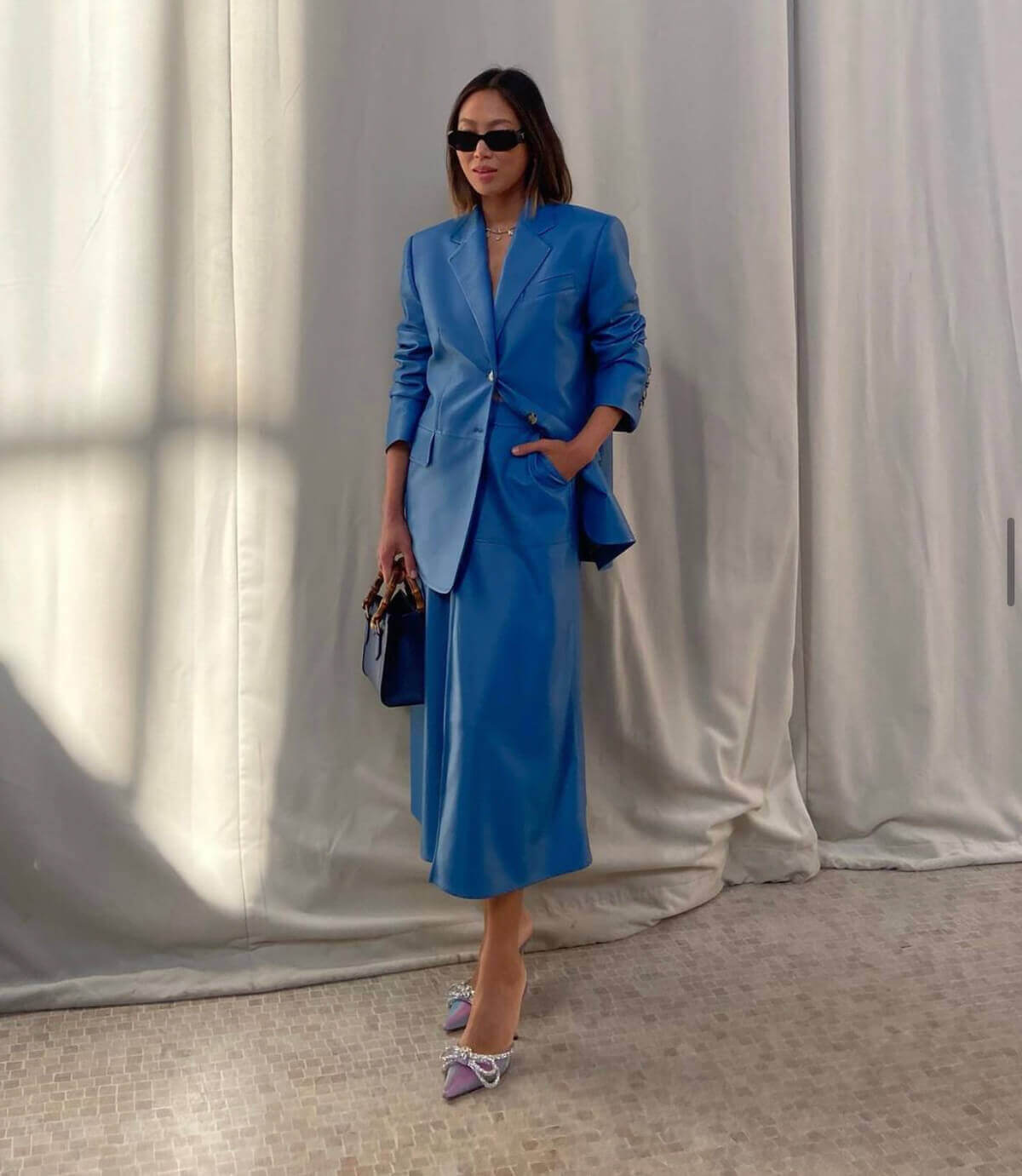 Ταγιέρ με δερμάτινες διαθέσεις: και σε έντονο χρώμα που κάνει «μπαμ» από μακριά. Μη φοβηθείτε να συνοδεύσετε τη midi φούστα με ένα oversized ή και μεσάτο σακάκι, αφού με αυτόν τον τρόπο το σύνολο θα δείξει πιο πλούσιο και δυναμικό. Badass και… σκληρό!