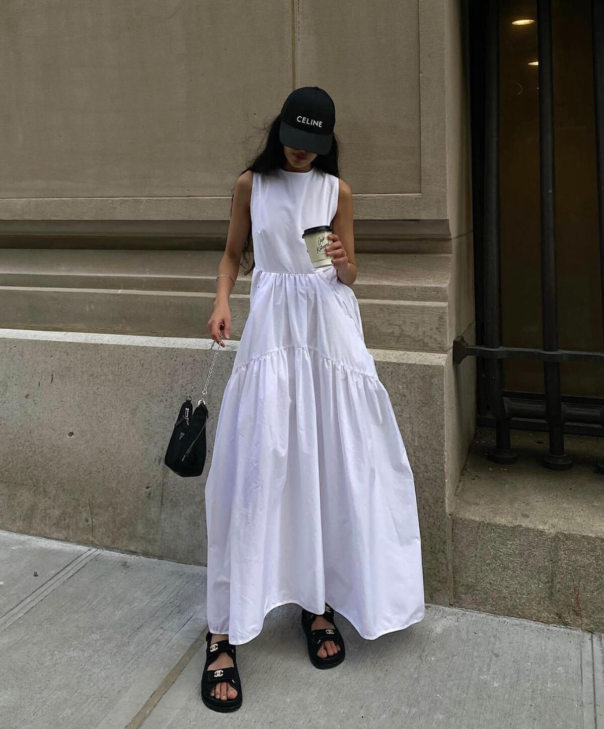 Φόρεμα ποπλίνα με scratch σανδάλια: ιδανικά flat για να αποθεώσουν τον cool χαρακτήρα του ρούχου. Τα αθλητικά επίσης, θα αποτελούσαν μια safe επιλογή, αλλά γιατί να μη δοκιμάσουμε κάτι πιο καλοκαιρινό;