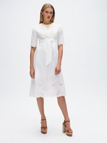 Φόρεμα με λεπτομέρειες από δαντέλα: Καλοκαιρινό, αέρινο φόρεμα με ντελικάτο κέντημα στο τελείωμα που αγκαλιάζει όμορφα το σώμα δημιουργώντας ένα εφέ κλεψύδρας. Συνδυάζεται με μοναδικά πέδιλα στιλάτα και άνετα που έχουν χοντρό τακούνι με λεπτομέρειες του μονογράμματος TH.