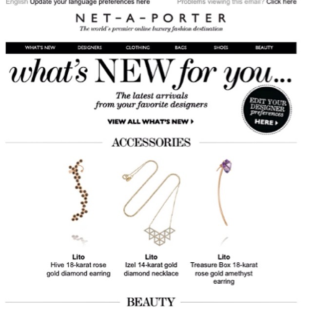 H Lito Karakostanoglou, πρώην μαθήτρια γλυπτικής και ζωγραφικής, είναι γνωστή σε αυτούς που αγαπούν τα ιδιαίτερα κοσμήματα καθώς το μαγαζί της στο Κολωνάκι αποτελεί έναν επίγειο παράδεισο όπου λεπτές αλυσίδες με ματάκια, μπλέκονται με εντυπωσιακά δαχτυλίδια σε σχήμα κερήθρας και cuffs και σκουλαρίκια με γεωμετρικές φόρμες Η Lito, που εμπνέεται από τα μακρινά ταξίδια της στον κόσμο και τον αναπάντεχο συνδυασμό πολύτιμων λίθων, κοραλλιών και άλλων πετρών, ήρθε η ώρα να ανοίξει και τα «επαγγελματικά» φτερά της και πέρα από την Ελλάδα και μάλιστα σε συνεργασία με ένα από τους πιο διάσημους shopping προορισμούς στο διαδίκτυο. Εδώ και λίγο καιρό λοιπόν πωλούνται στο online store Net-A-Porter, με τους πελάτες από όλα τα μήκη και πλάτη της γης να δείχνουν ιδιαίτερο ενδιαφέρον αφού πολλά από αυτά εξαντλούνται σχεδόν αμέσως. Δείτε κι εσείς τη δουλειά της εδώ.
