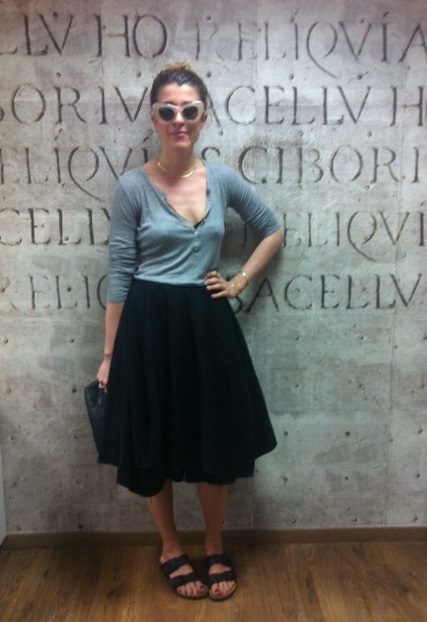 Σήμερα λοιπόν επέλεξε να φορέσει τοπ Zara, με φούστα Comme Des Garçons, τα οποία συνδύασε με σανδάλια Birkenstock. Αυτό που μας άρεσε περισσότερο από όλα είναι ότι αποφάσισε να δώσει μια πιο ρετρό νότα στο σύνολό της με ένα ζευγάρι γυαλιά Céline.