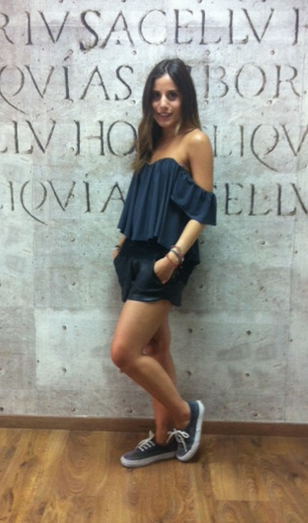 Η Δέσποινα λοιπόν, που αγαπάει το μαύρο και τις μονοχρωμίες γενικά, αποφάσισε και σήμερα να φορέσει ένα total black σύνολο το οποίο αποτελούνταν από μαύρο, off the shoulder top με την υπογραφή J’aime les Garçons, το οποίο συνδύασε με σορτς από τα καταστήματα Zara. Τέλος επέλεξε ένα ζευγάρι άνετα παπούτσια της εταιρείας Vans για να ολοκληρώσει το outfit της.