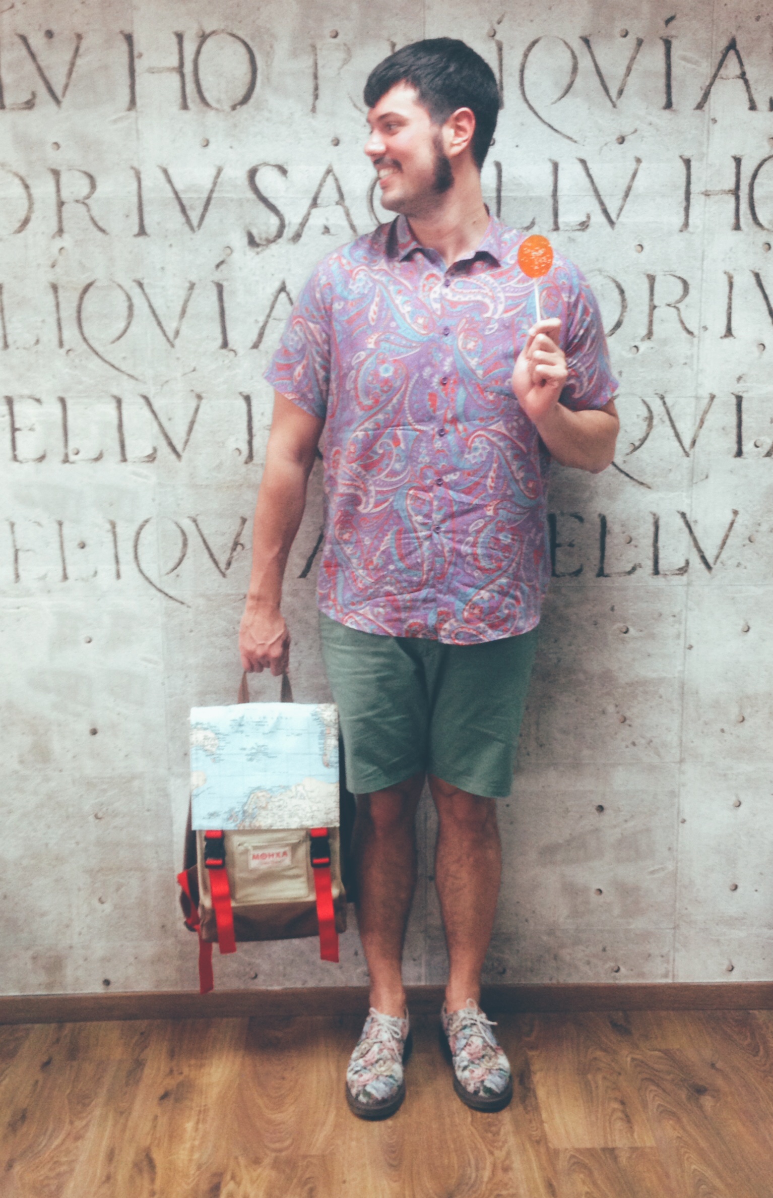 Σήμερα λοιπόν φοράει πουκάμισο Kolke και τσάντα Billy Tenembaum. Και τα δύο φέρουν την υπογραφή του brand Moxha. Το σορτς είναι H&M και τα παπούτσια που ολοκληρώνουν το look είναι Dr. Martens. Οι αισθητικές του αναφορές είναι τα cool kids της Καλιφόρνια και οι indie μπάντες τουWest Coast.