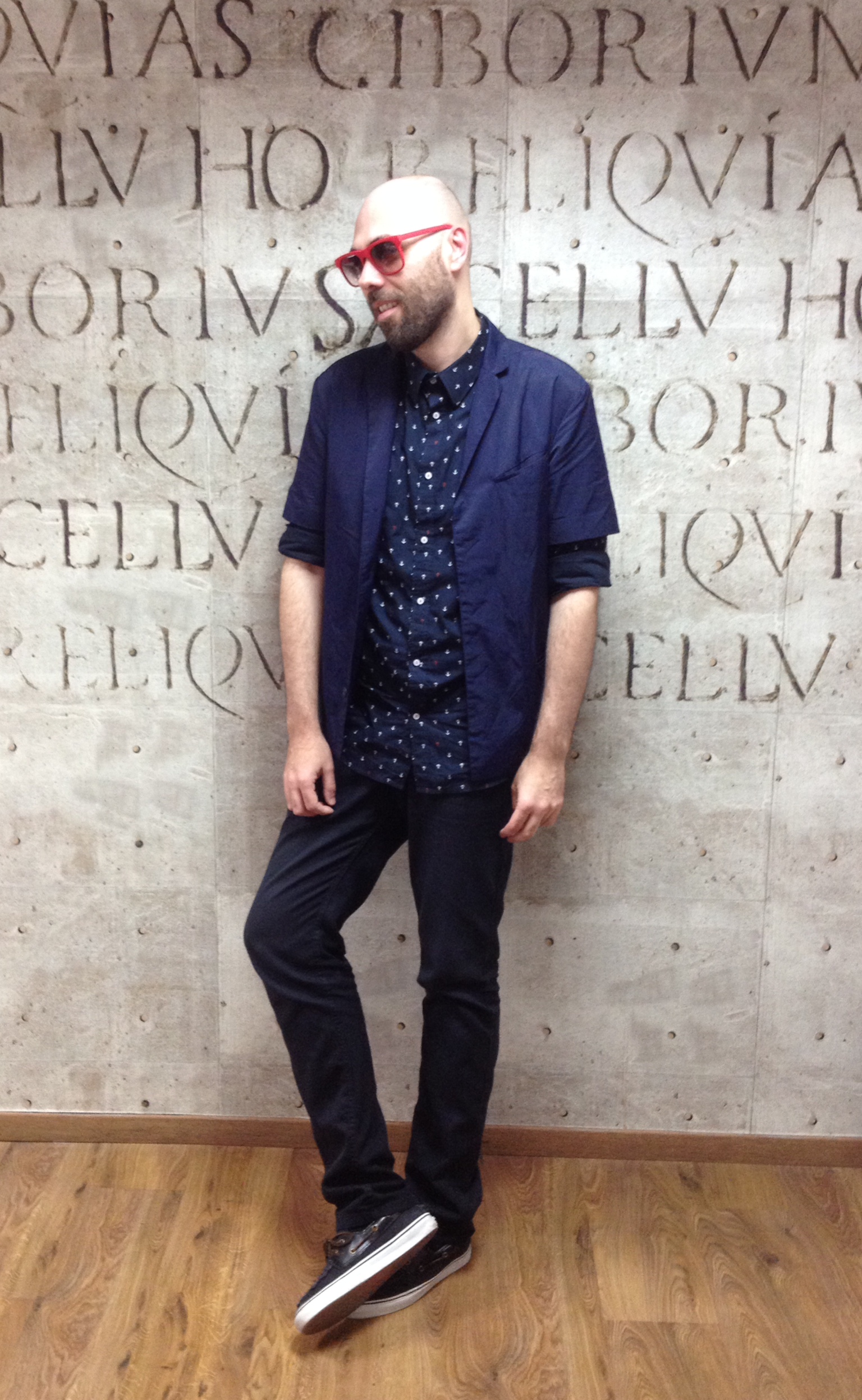 Ο ευχάριστος χαρακτήρας του, αντικατοπτρίζεται και στο ντύσιμό του που είναι πάντα προσεγμένο. Σήμερα τον φωτογραφίσαμε γιατί μας άρεσε το σκούρο μπλε που φόρεσε, το οποίο θεωρούμε πολύ chic τόσο για τους άνδρες όσο και για τις γυναίκες. Φοράει σακάκι Jil Sander και από μέσα πουκάμισο Η&Μ. Το παντελόνι του είναι vintage Levi’s και τα παπούτσια του είναι από την εταιρεία Vans. Το look ολοκληρώνουν τα κόκκινα γυαλιά ηλίου που έχουν άκρως καλοκαιρινή διάθεση και φέρουν την υπογραφή Cheap Monday.