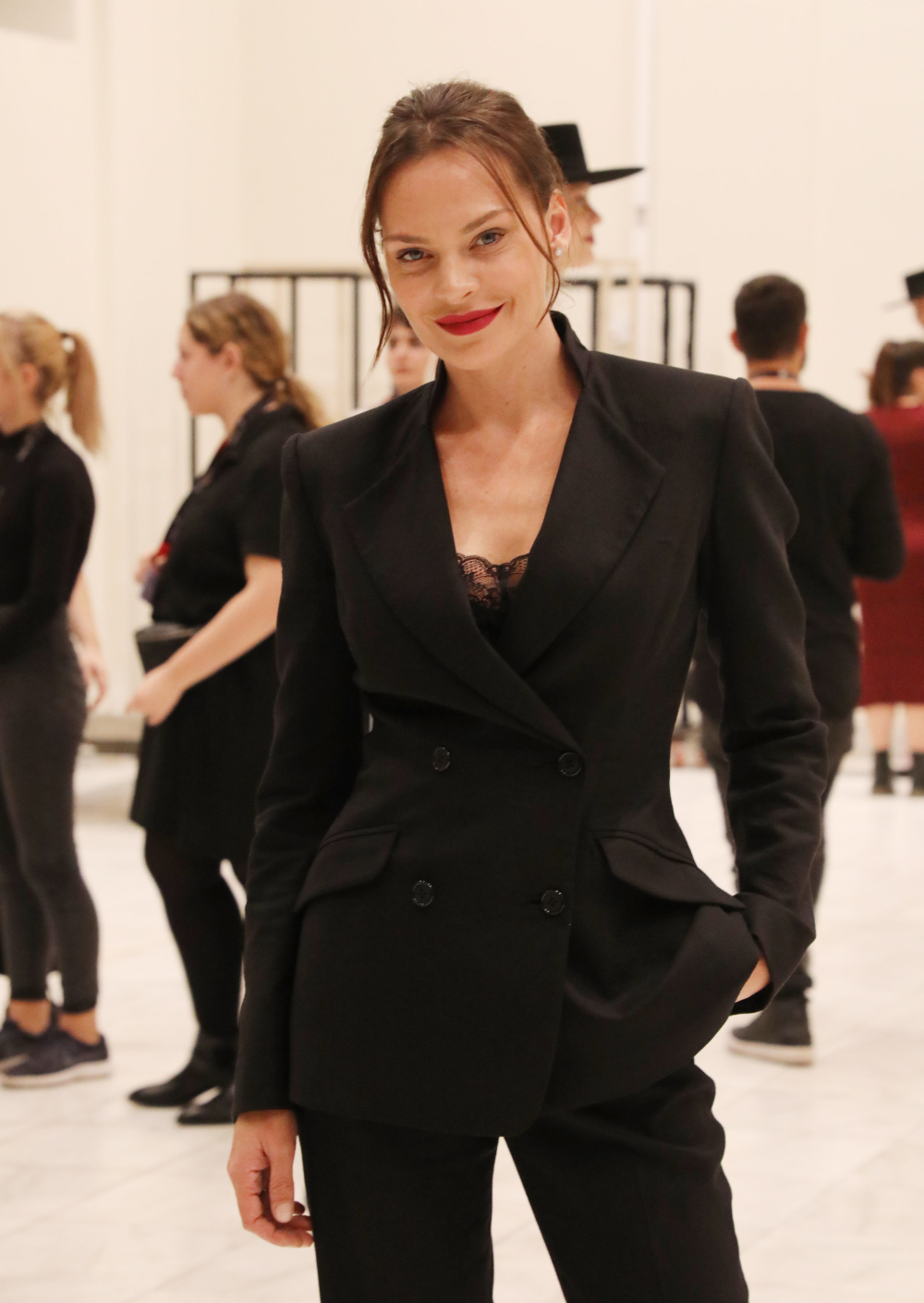 Εκτός από τη συλλογή και το fashion show, αυτό που μας ενθουσίασε είναι το σύνολο της σχεδιάστριας. Η Υβόννη Μπόσνιακ επέλεξε να φορέσει ένα μαύρο κοστούμι, το οποίο συνδύασε με ένα μαύρο δαντελένιο lingerie και ένα ζευγάρι μαύρα loafers με χρυσές λεπτομέρειες. Το look της ήταν σούπερ κομψό και chic, αλλά και πολύ θηλυκό.