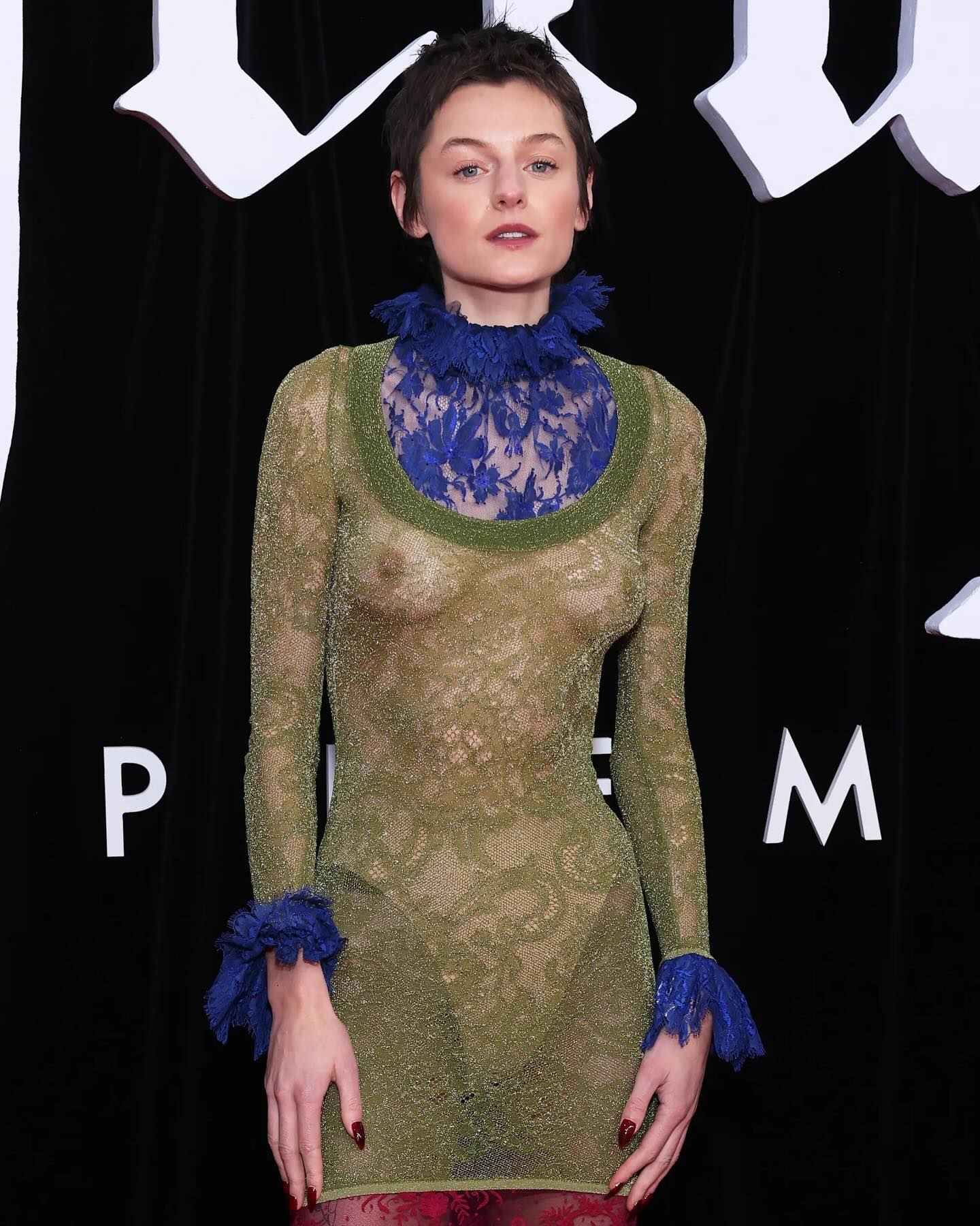 Το Emma έκανε την εμφάνισή του στο κόκκινο χαλί του Βερολίνου για την πρεμιέρα της ταινίας Nosferatu. Μάλιστα, φόρεσε ένα εκθαμβωτικό μίνι φόρεμα από τη συλλογή Saint Laurent Άνοιξη 2025. Το φόρεμα συνδύαζε διαφάνειες σε μπλε, πράσινο και κόκκινο χρώμα και είχε ένα άκρως μοντέρνο και ταυτόχρονα τολμηρό σχέδιο από διάφανη δαντέλα. Το look ολοκλήρωσε με ένα ζευγάρι sling-backs με χρυσά τακούνια, που έδιναν μια έντονη αντίθεση και μια πινελιά εκλεπτυσμένης χλιδής. Όλη η εμφάνιση είχε έναν αέρα από ανατρεπτική κομψότητα που ενσωμάτωνε την τάση του «γυμνού φορέματος». Χωρίς ωστόσο να αποπνέει τον συνηθισμένο ερωτισμό. Αντίθετα, τα χρώματα του φορέματος δημιουργούσαν μια ιδιαίτερη ατμόσφαιρα, κάνοντάς το να μοιάζει περισσότερο σαν αντι-αφροδισιακό παρά προκλητικό.