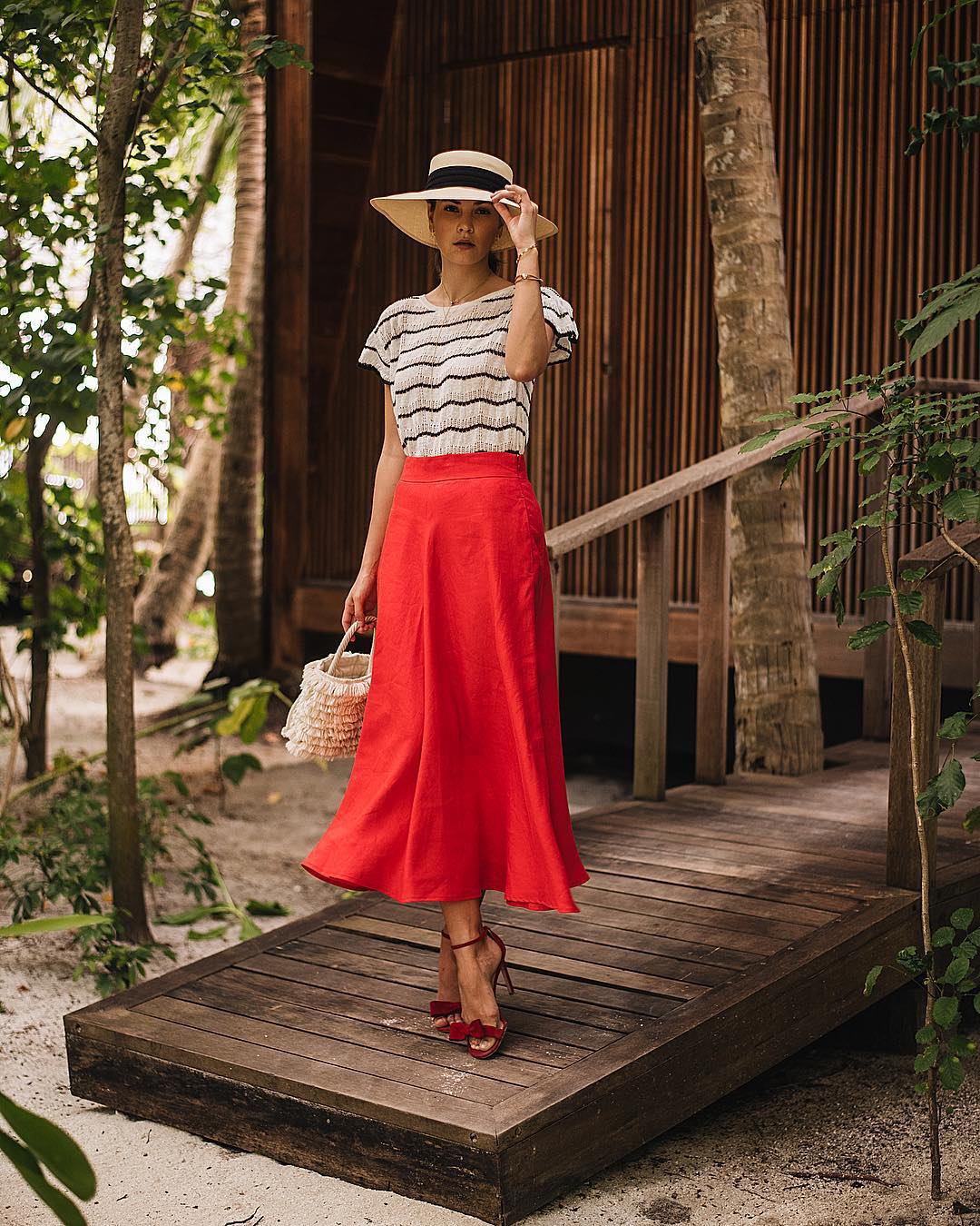 Μία midi φούστα σε κόκκινο χρώμα μπορεί να φορεθεί και στην πόλη και στο νησί. Συνδυάζετε τέλεια με τις αγαπημένες μας μαρινιέρες και μας βοηθούν να δημιουργήσουμε navy looks.